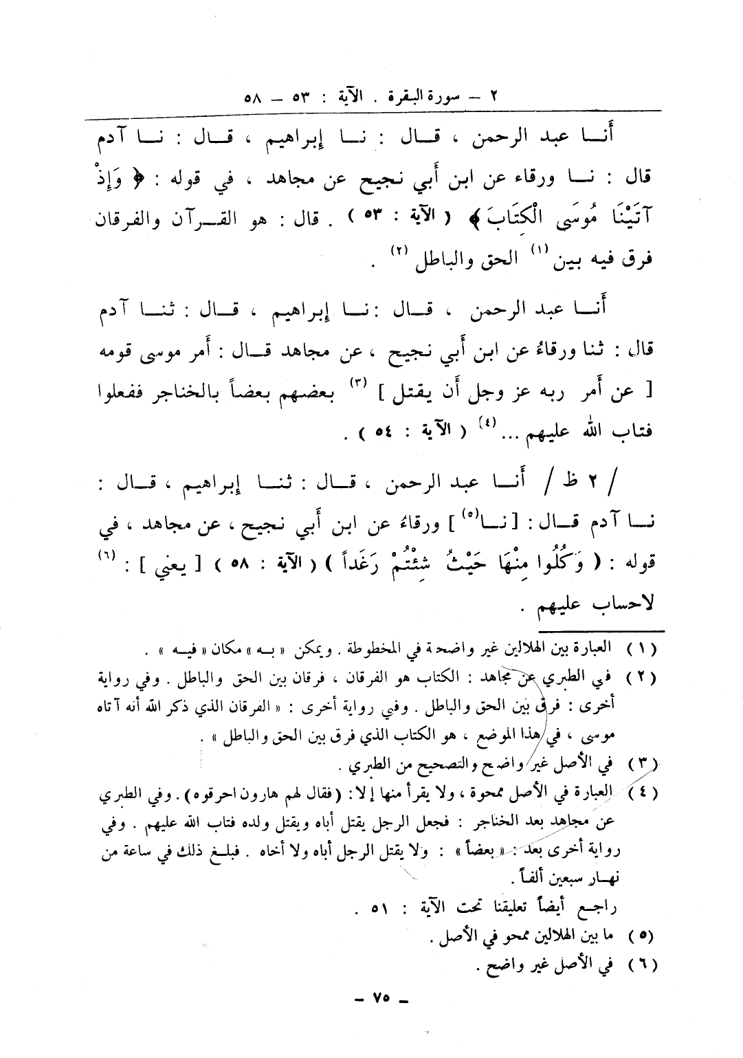 انا عبد الرحمن قال نا إبراهيم قال نا آدم قال نا ورقاء عن ابن أبي نجيح عن مجاهد في قوله وإذ آتينا موسى الكتاب قال هو القرآن والفرقان فرق فيه بين الحق والباطل