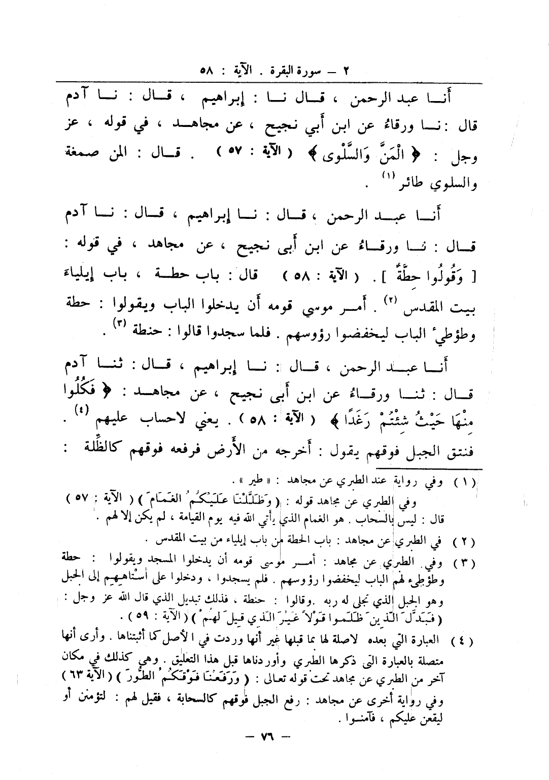 أنا عبد الرحمن قال نا إبراهيم قال نا آدم قال نا ورقاء عن ابن أبي نجيح عن مجاهد في قوله عز و جل المن السلوى قال المن صمغة والسلوى طائر
