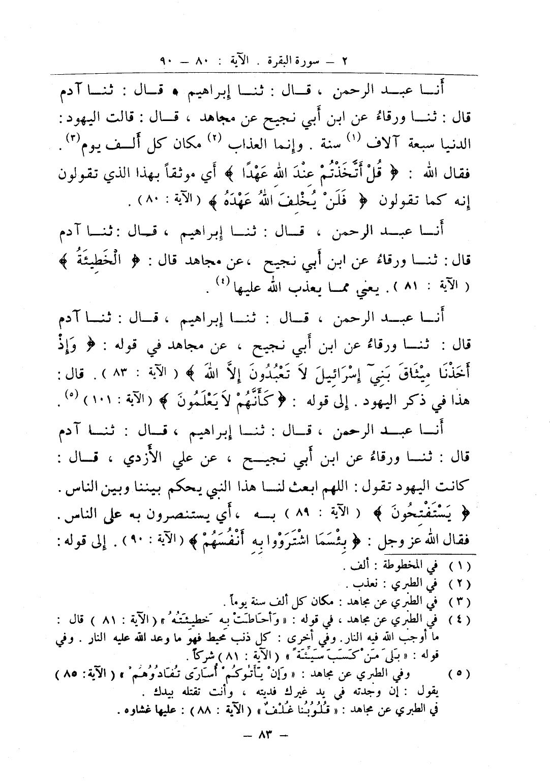 أنا عبد الرحمن قال ثنا إبراهيم قال ثنا آدم قال ثنا ورقاء عن ابن أبي نجيح عن مجاهد في قوله وإذ أخذنا ميثاق بني إسرائيل لا تعبدون إلا الله قال هذا في ذكر اليهود إلى قوله كأنهم لا يعلمون