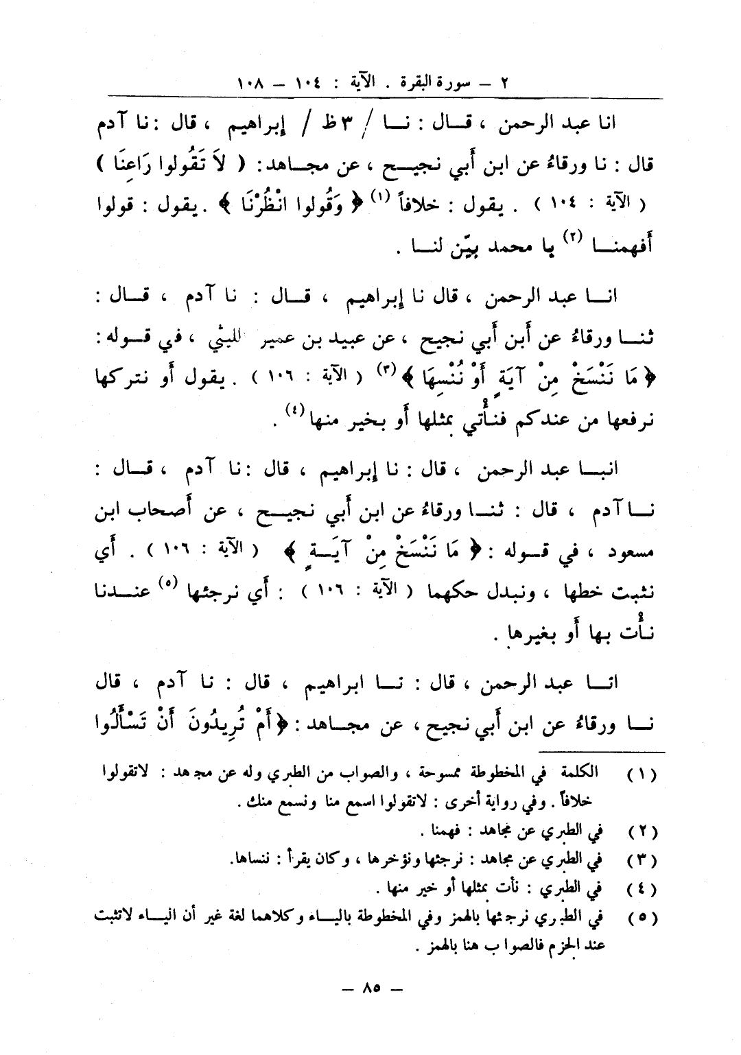 انبا عبد الرحمن قال نا إبراهيم قال نا آدم قال نا آدم قال ثنا ورقاء عن ابن أبي نجيح عن أصحاب ابن مسعود في قوله ما ننسخ من آية أي نثبت خطها ونبدل حكمها أي نرجئها عندنا نأت بها أو بغيرها