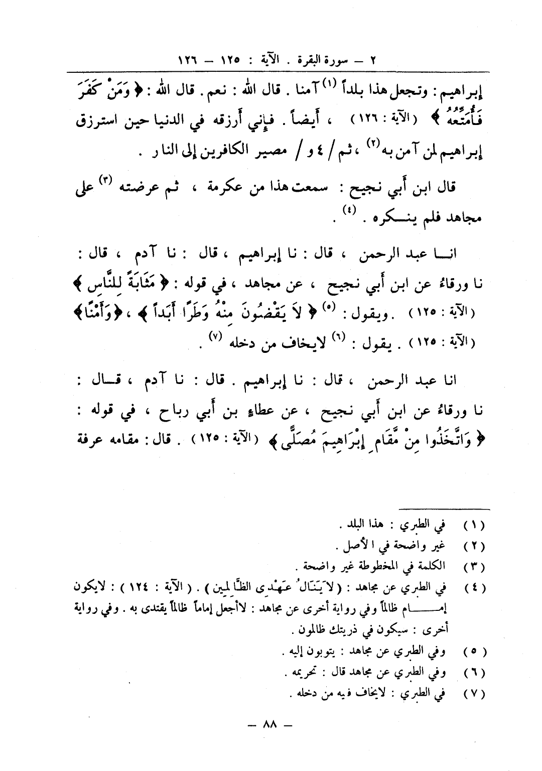 انا عبد الرحمن قال نا إبراهيم قال نا آدم قال نا ورقاء عن ابن أبي نجيح عن مجاهد في قوله مثابة للناس ويقول لا يقضون منه وطرا أبدا وأمنا يقول لا يخاف من دخله