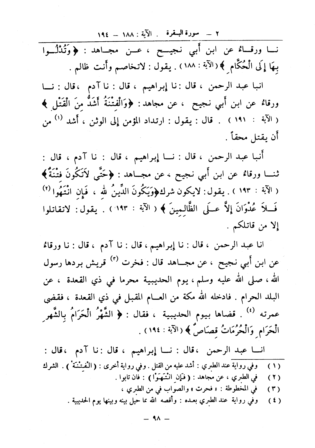انبا عبد الرحمن قال نا إبراهيم قال نا آدم قال نا ورقاء عن ابن أبي نجيح عن مجاهد والفتنة أشد من القتل قال يقول ارتداد المؤمن الى الوثن أشد من أن يقتل محقا