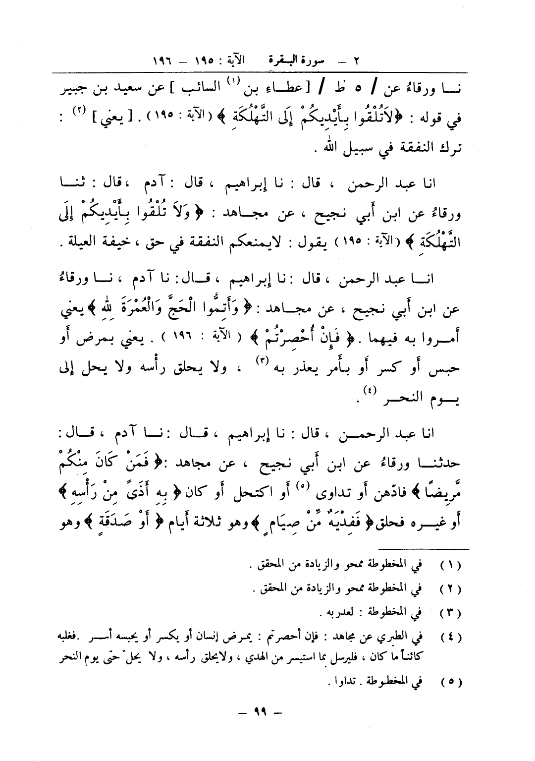 انا عبد الرحمن قال نا إبراهيم قال آدم قال ثنا ورقاء عن ابن أبي نجيح عن مجاهد ولا تلقوا بأيديكم إلى التهلكة يقول لا يمنعكم النفقة في حق خيفة العيلة