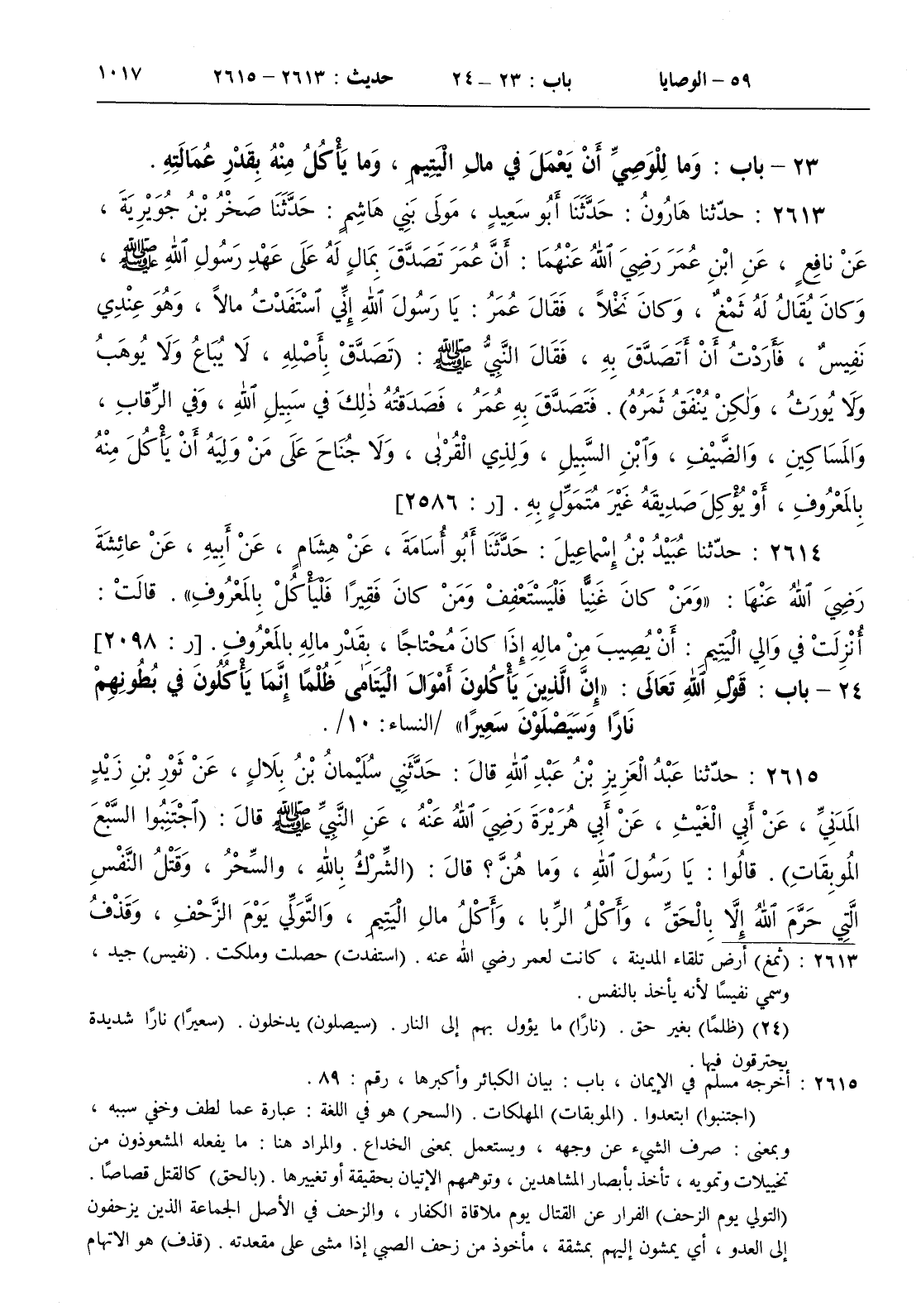 24 - باب قول الله تعالى { إن الذين يأكلون أموال اليتامى ظلما إنما يأكلون في بطونهم نارا وسيصلون سعيرا } . / النساء 10 /