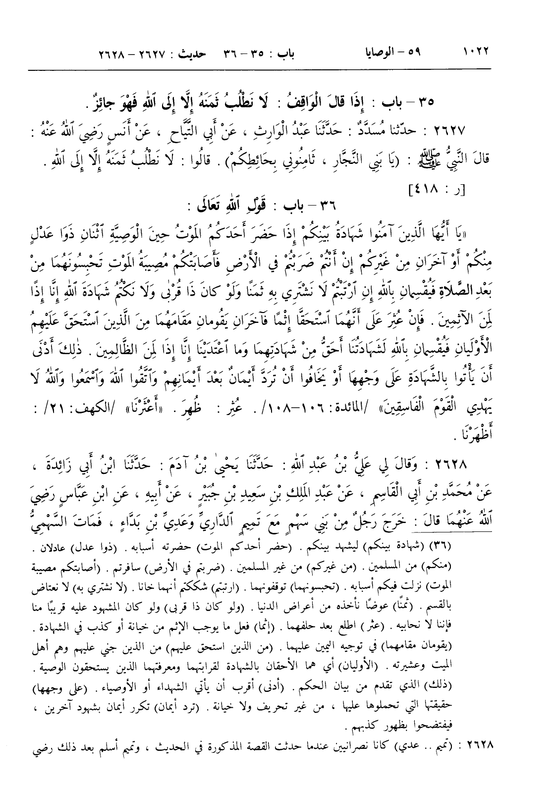 [ ش ( تميم . . عدي ) كانا نصرانيين عندما حدثت القصة المذكورة في الحديث وتميم أسلم بعد ذلك رضي الله عنه وأما عدي فلم يسلم . ( جاما ) كأسا . ( مخوصا ) منقوشا فيه خطوط دقيقة طويلة كالخوص وهو ورق النخل . ( أوليائه ) من أولياء السهمي والرجلان هما عمرو بن العاص والآخر قيل هو المطلب بن أبي وداعة رضي الله عنهما ]