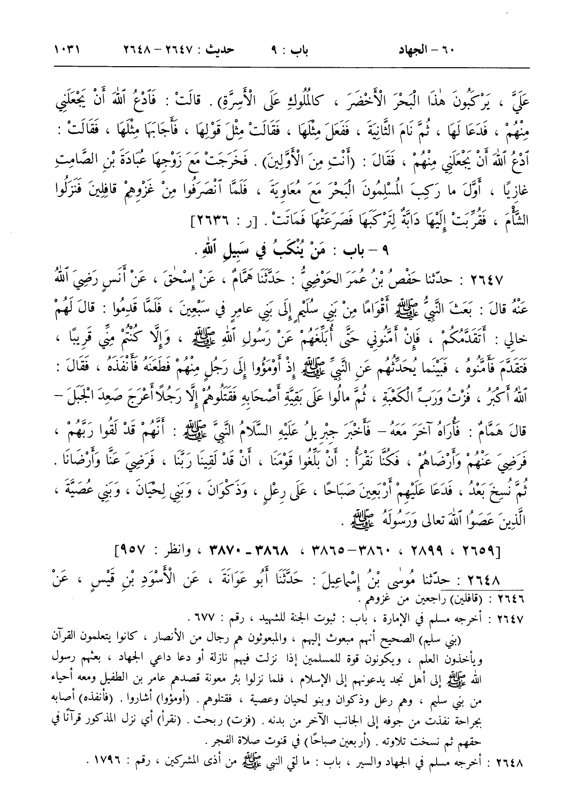 [ ش أخرجه مسلم في الإمارة باب ثبوت الجنة للشهيد رقم 766 . ( بني سليم ) الصحيح أنهم مبعوث إليهم والمبعوثون هم رجال من الأنصار كانوا يتعلمون القرآن ويأخذون العلم ويكونون قوة للمسلمين إذا نزلت فيهم نازلة أو دعا داعي الجهاد بعثهم رسول الله صلى الله عليه و سلم إلى أهل نجد يدعونهم إلى الإسلام فلما نزلوا بئر معونة قصدهم عامر بن الطفيل ومعه أحياء من بني سليم وهم رعل وذكوان وبنو لحيان وعصية فقتلوهم . ( أومؤوا ) أشاروا . ( فأنفذه ) أصابه بجراحة نفذت من جوفه إلى الجانب الآخر من بدنه . ( فزت ) ربحت . ( نقرأ ) أي نزل المذكور قرآنا في حقهم ثم نسخت تلاوته . ( أربعين صباحا ) في قنوت صلاة الفجر ]