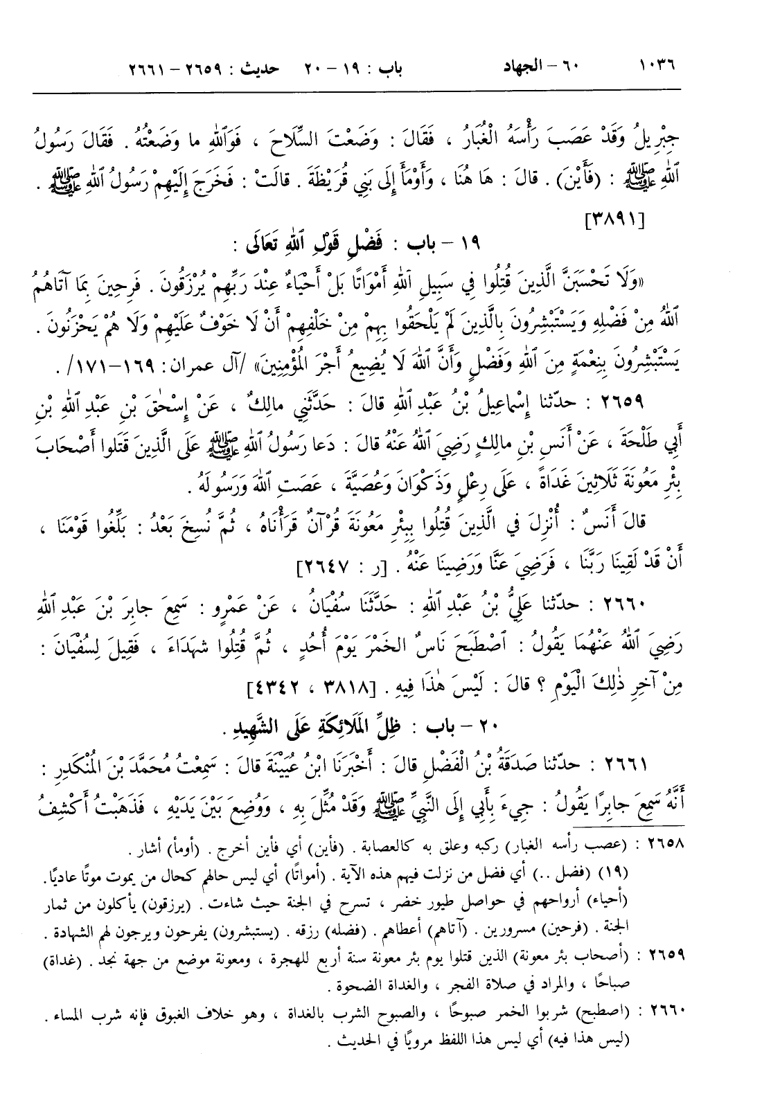 : جيء بأبي إلى النبي صلى الله عليه و سلم وقد مثل به ووضع بين يديه فذهبت أكشف عن وجهه فنهاني قومي فسمع صوت صائحة فقيل ابنة عمرو أو أخت عمرو فقال ( لم تبكي - أو لا تبكي - ما زالت الملائكة تظله بأجنحتها ) . قلت لصدقة أفيه ( حتى رفع ) . قال ربما قاله
