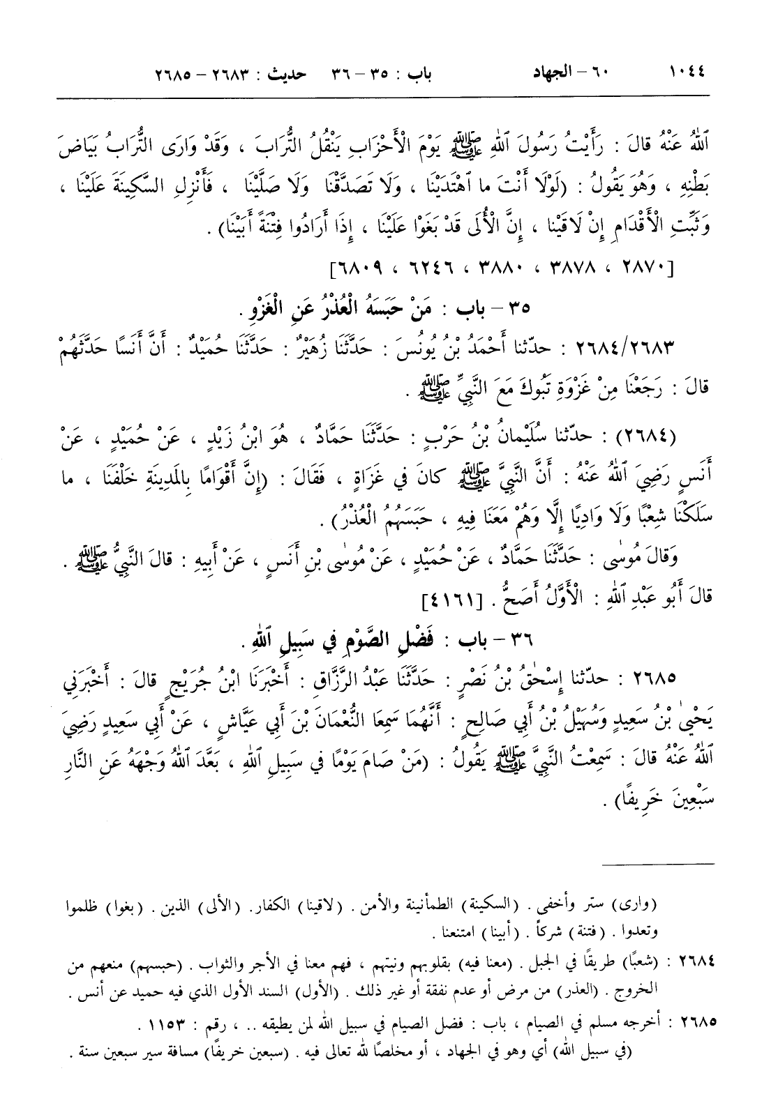 [ ش ( شعبا ) طريقا في الجبل . ( معنا فيه ) بقلوبهم ونيتهم فهم معنا في الأجر والثواب . ( حبسهم ) منعهم من الخروج . ( العذر ) من مرض أو عدم نفقة أو غير ذلك . ( الأول ) السند الأول الذي فيه حميد عن أنس ]