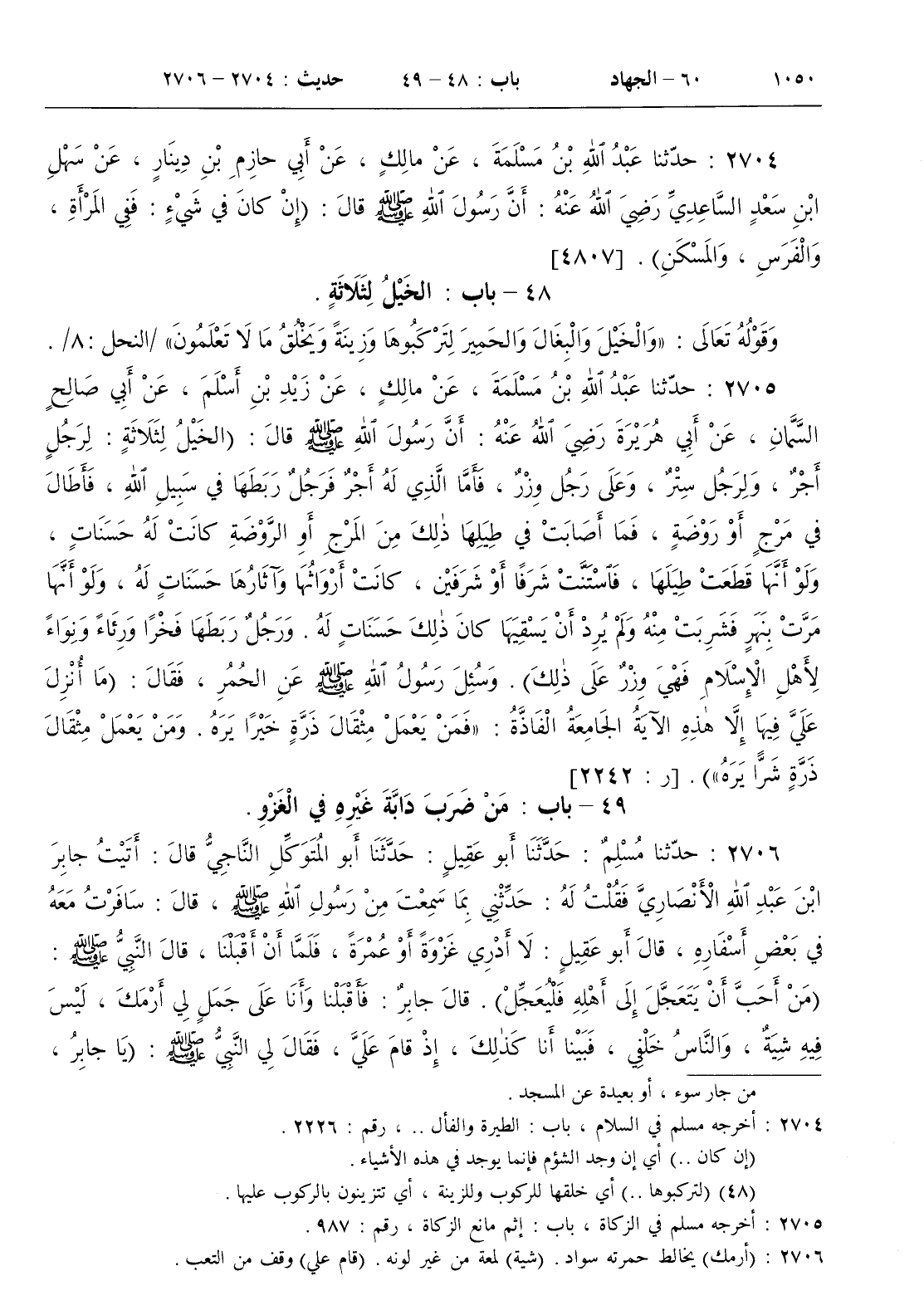 : أن رسول الله صلى الله عليه و سلم قال ( الخيل لثلاثة لرجل أجر ولرجل ستر وعلى رجل وزر فأما الذي له أجر فرجل ربطها في سبيل الله فأطال في مرج أو روضة فما أصابت في طيلها ذلك من المرج أو الروضة كانت له حسنات ولو أنها قطعت طيلها فاستنت شرفا أو شرفين كانت أرواثها وآثارها حسنات له ولو أنها مرت بنهر فشربت منه ولم يرد أن يسقيها كان ذلك حسنات له . ورجل ربطها فخرا ورئاء ونواء لأهل الإسلام فهي وزر على ذلك ) . وسئل رسول الله صلى الله عليه و سلم عن الحمر فقال ( ما أنزل علي فيها إلا هذه الآية الجامعة الفاذة { فمن يعمل مثقال ذرة خيرا يرى . ومن يعمل مثقال ذرة شرا يره } )