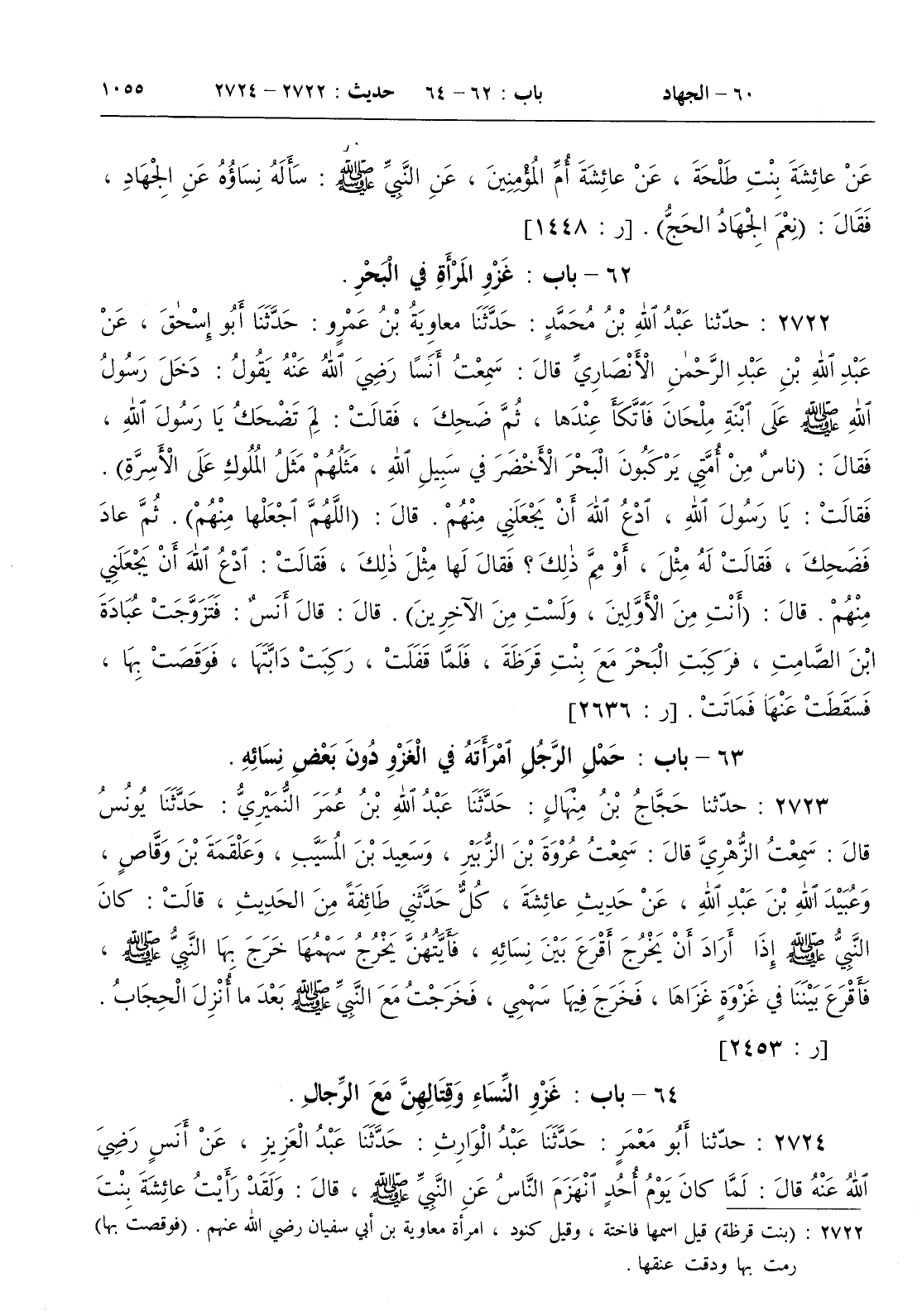 : دخل رسول الله صلى الله عليه و سلم على ابنة ملحان فاتكأ عندها ثم ضحك فقالت لم تضحك يا رسول الله فقال ( أناس من أمتي يركبون البحر الأخضر في سبيل الله مثلهم مثل الملوك على الأسرة ) . فقالت يا رسول الله ادع الله أن يجعلني منهم . قال ( اللهم اجعلها منهم ) . ثم عاد فضحك فقالت له مثل أو مم ذلك ؟ فقال لها مثل ذلك فقالت ادع الله أن يجعلني منهم . قال ( أنت من الأولين ولست من الآخرين ) . قال قال أنس فتزوجت عبادة بن الصامت فركبت البحر مع بنت قرظة فلما قفلت ركبت دابتها فوقصت بها فسقطت عنها فماتت