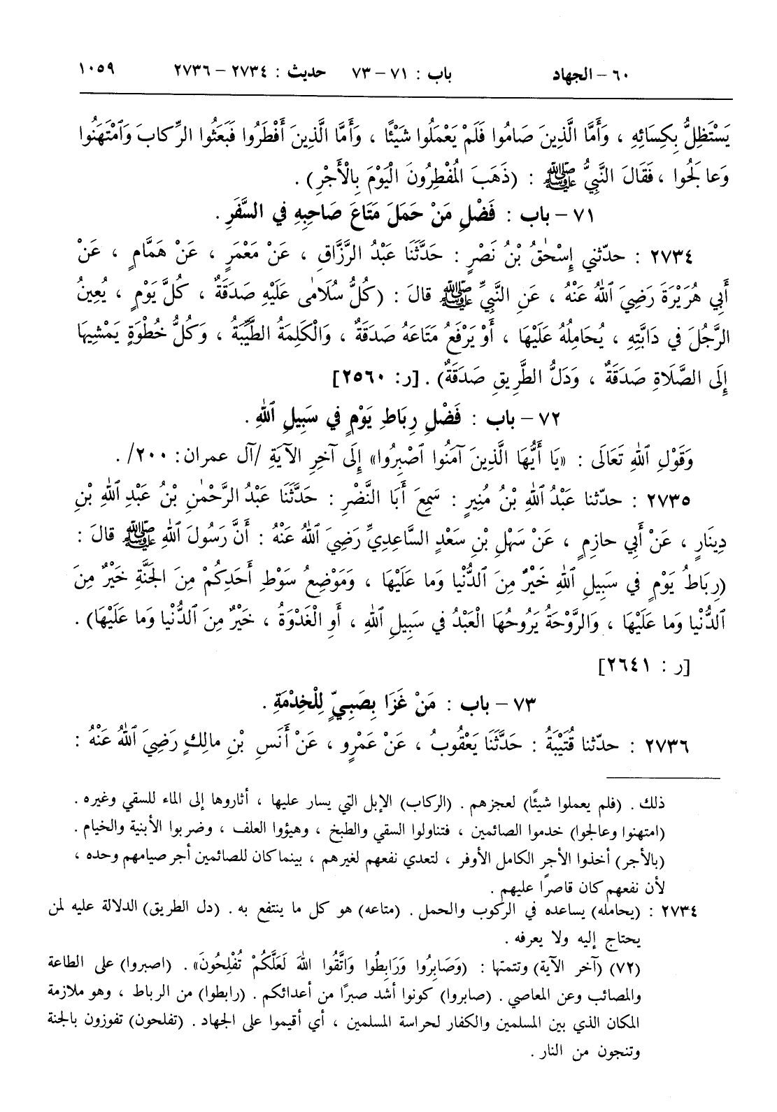 : أن رسول الله صلى الله عليه و سلم قال ( رباط يوم في سبيل الله خير من الدنيا وما عليها وموضع سوط أحدكم من الجنة خير من الدنيا وما عليها والروحة يروحها العبد في سبيل الله أو الغدوة خير من الدنيا وما عليها )