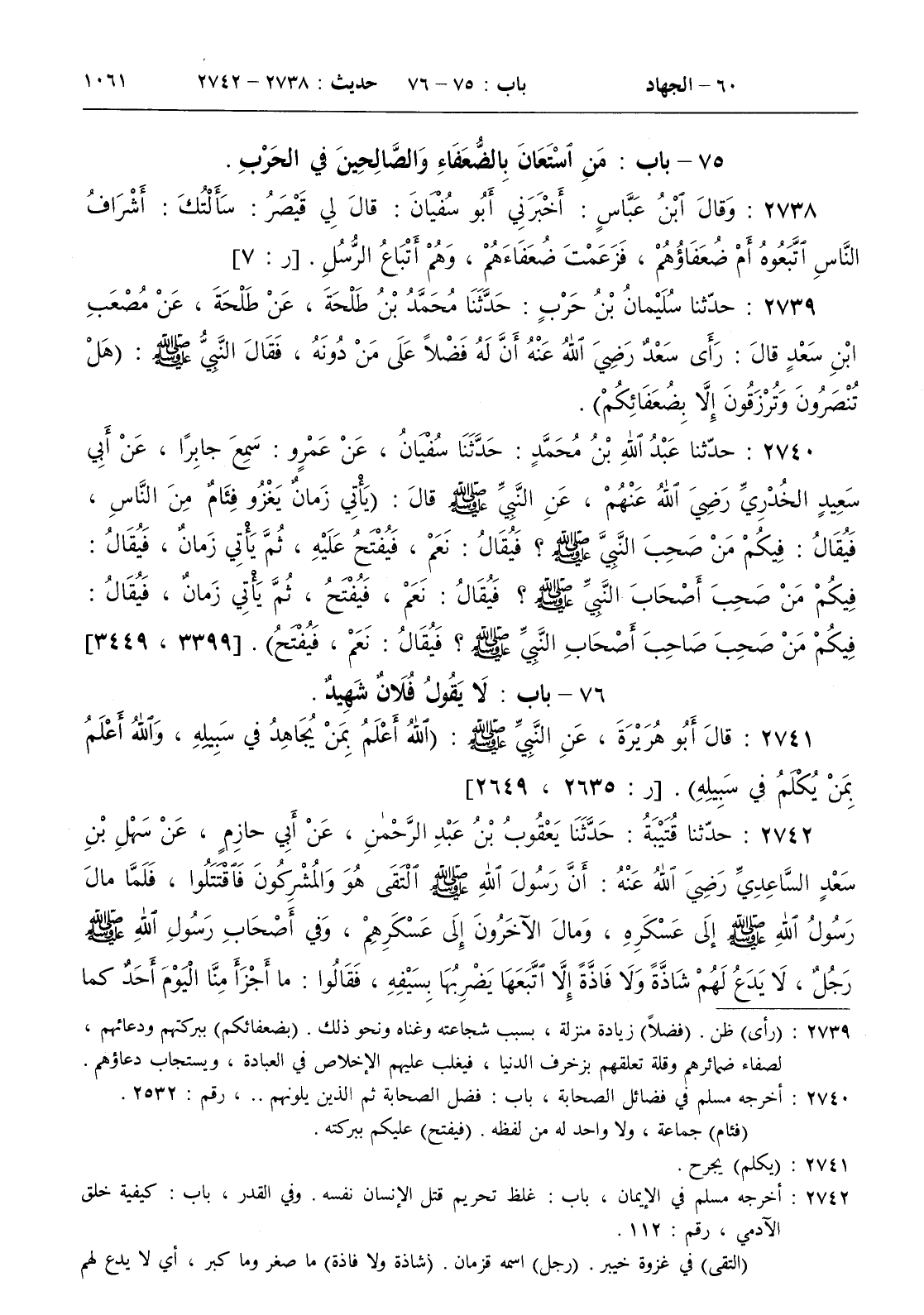 2741 - قال أبو هريرة عن النبي صلى الله عليه و سلم ( الله أعلم بمن يجاهد في سبيله والله أعلم بمن يكلم في سبيله )