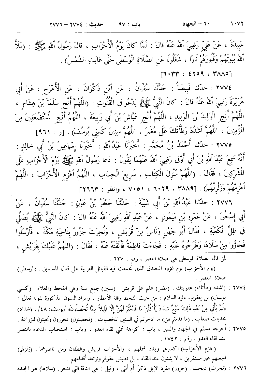 : دعا رسول الله صلى الله عليه و سلم يوم الأحزاب على المشركين فقال ( اللهم منزل الكتاب سريع الحساب اللهم اهزم الأحزاب اللهم اهزمهم وزلزلهم )