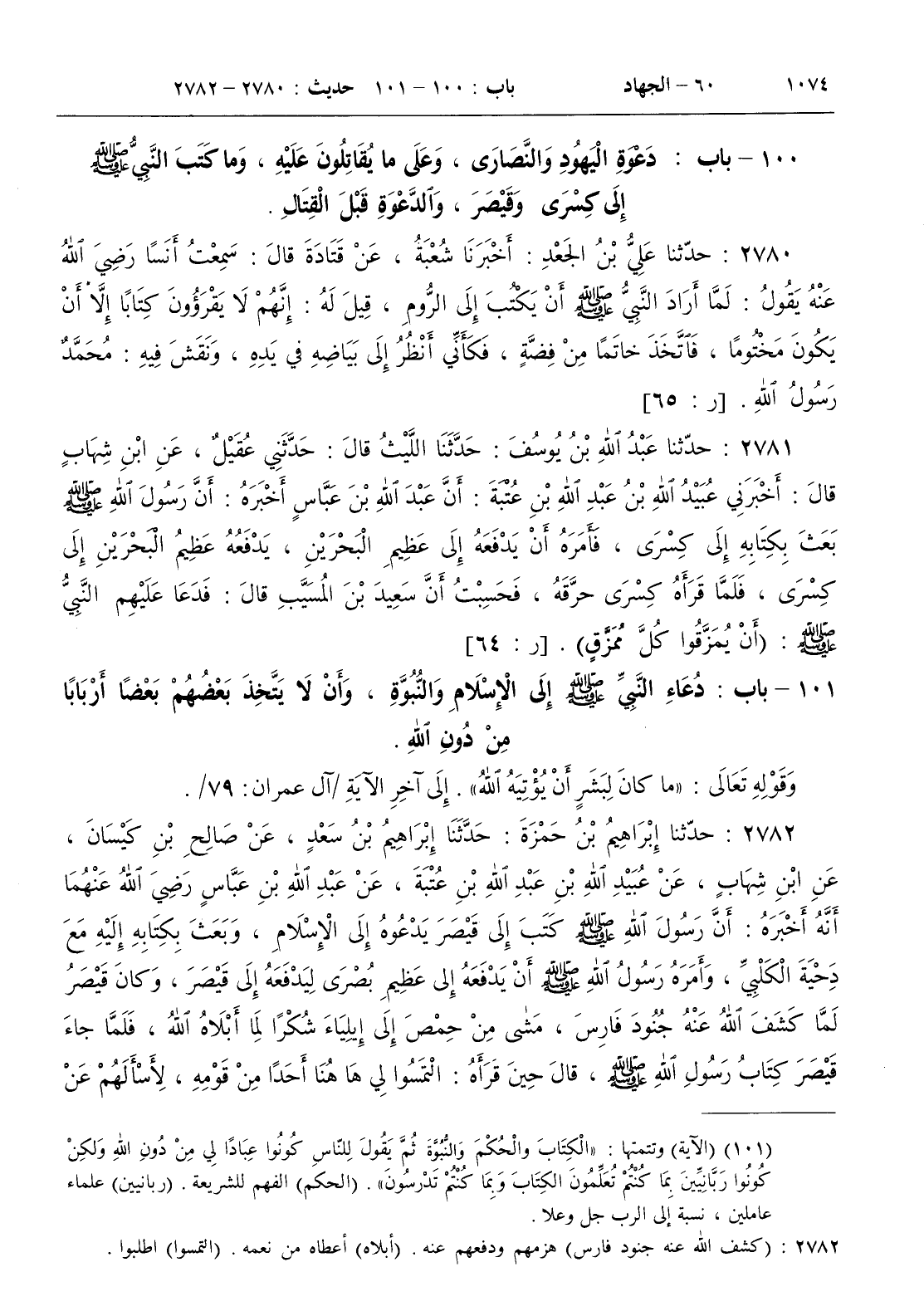 101 - باب دعاء النبي صلى الله عليه و سلم إلى الإسلام والنبوة وأن لا يتخذ بعضهم بعضا أربابا من دون الله