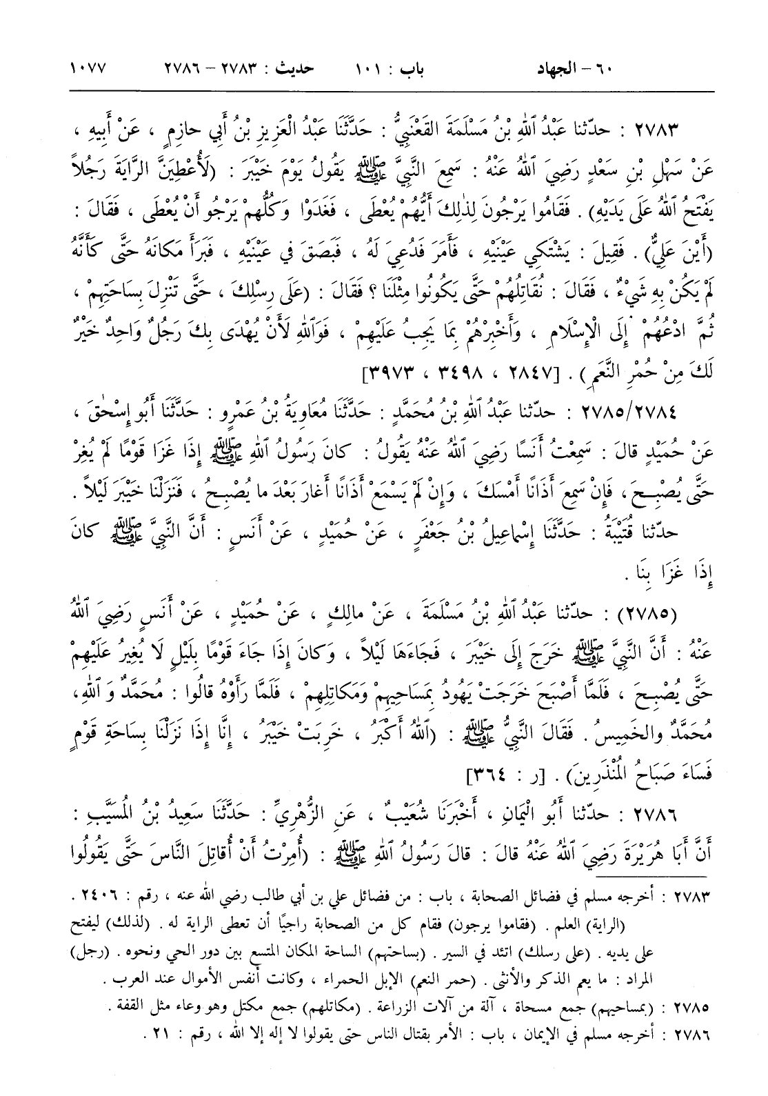 : أن النبي صلى الله عليه و سلم خرج إلى خيبر فجاءها ليلا وكان إذا جاء قوما بليل لا يغير عليهم حتى يصبح فلما أصبح خرجت يهود بمساحيهم ومكاتلهم فلما رأوه قالوا محمد والله محمد والخميس . فقال النبي صلى الله عليه و سلم ( الله أكبر خربت خيبر إنا إذا نزلنا بساحة قوم فساء صباح المنذرين )