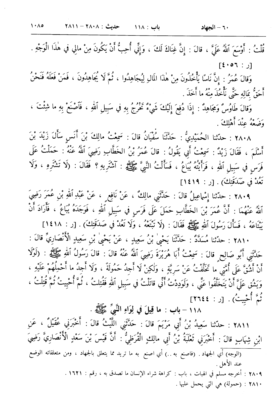 : حملت على فرس في سبيل الله فرأيته يباع فسألت النبي صلى الله عليه و سلم آشتريه ؟ فقال ( لا تشتره ولا تعد في صدقتك )