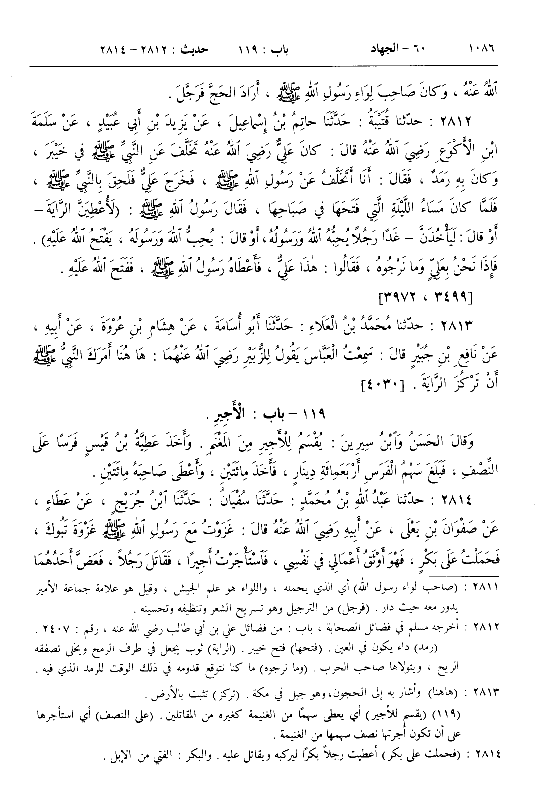 : كان علي رضي الله عنه تخلف عن النبي صلى الله عليه و سلم في خيبر وكان به رمد فقال أنا أتخلف عن رسول الله صلى الله عليه و سلم فخرج علي فلحق بالنبي صلى الله عليه و سلم فلما كان مساء الليلة التي فتحها في صباحها فقال رسول الله صلى الله عليه و سلم ( لأعطين الراية - أو قال ليأخذن - غدا رجلا يحبه الله ورسوله أو قال يحب الله ورسوله يفتح الله عليه ) . فإذا نحن بعلي وما نرجوه فقالوا هذا علي فأعطاه رسول الله صلى الله عليه و سلم ففتح الله عليه