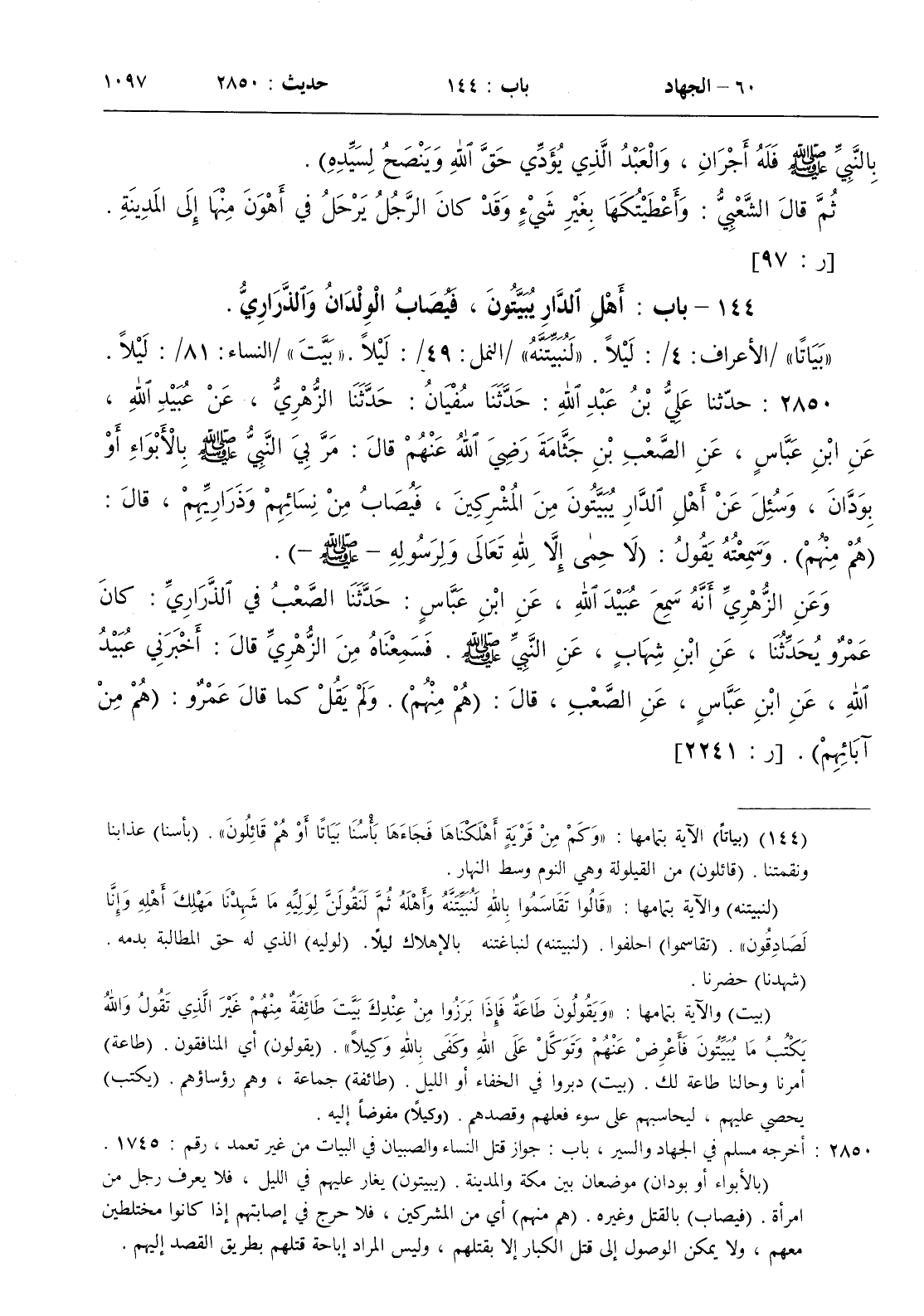 [ ش أخرجه مسلم في الجهاد والسير باب جواز قتل النساء والصبيان في البيات من غير تعمد رقم 1745 . ( بالأبواء أو بودان ) موضعان بين مكة والمدينة . ( يبيتون ) يغار عليهم في الليل فلا يعرف رجل من امرأة . ( فيصاب ) بالقتل وغيره . ( هم منهم ) أي من المشركين فلا حرج في