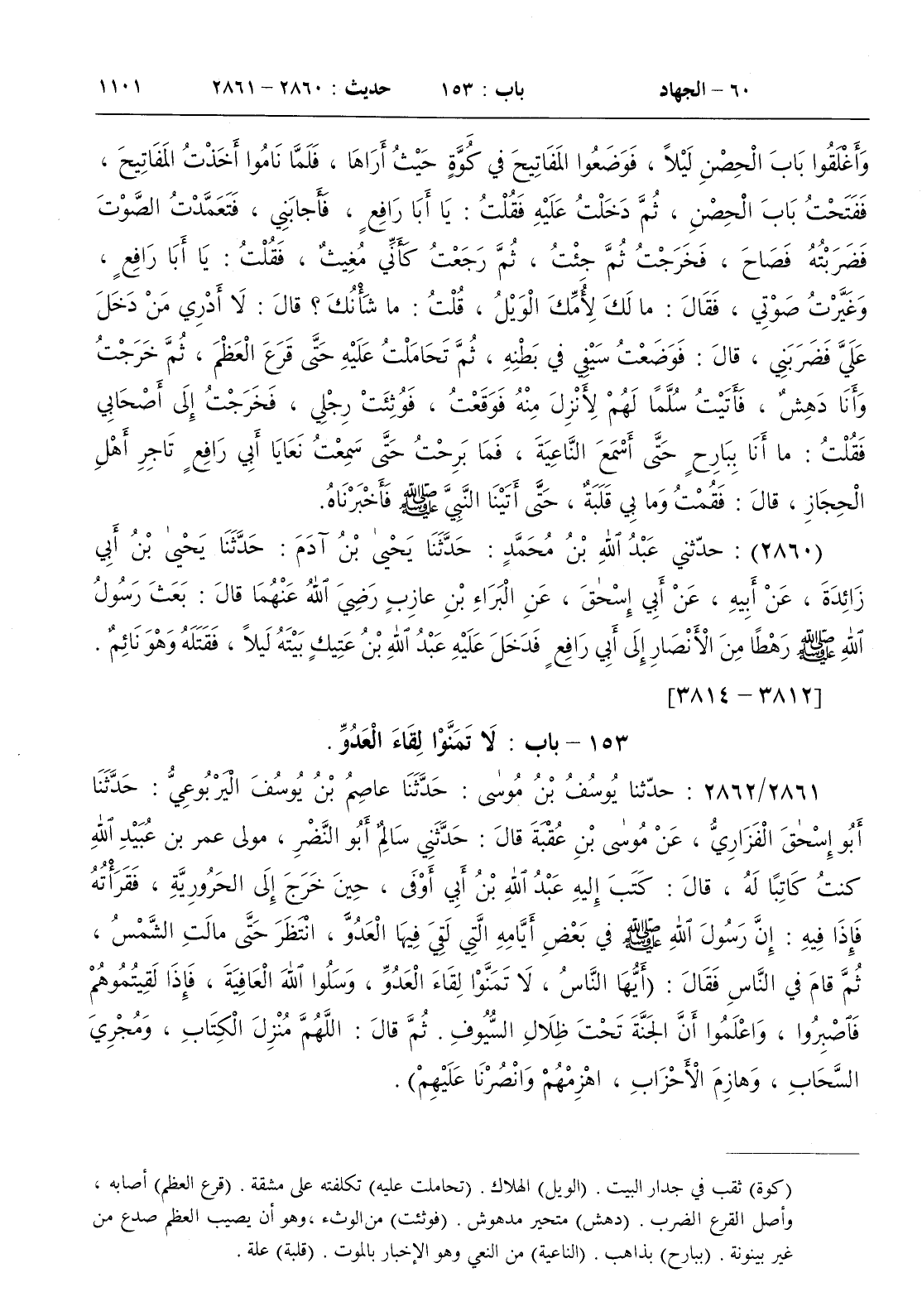 2861 - حدثنا يوسف بن موسى حدثنا عاصم بن يوسف اليربوعي حدثنا أبو إسحاق الفزاري عن موسى بن عقبة قال حدثني سالم أبو النضر مولى عمر بن عبيد الله كنت كاتبا له قال كتب إليه عبد الله بن أبي أوفى حين خرج إلى الحرورية فقرأته فإذا فيه