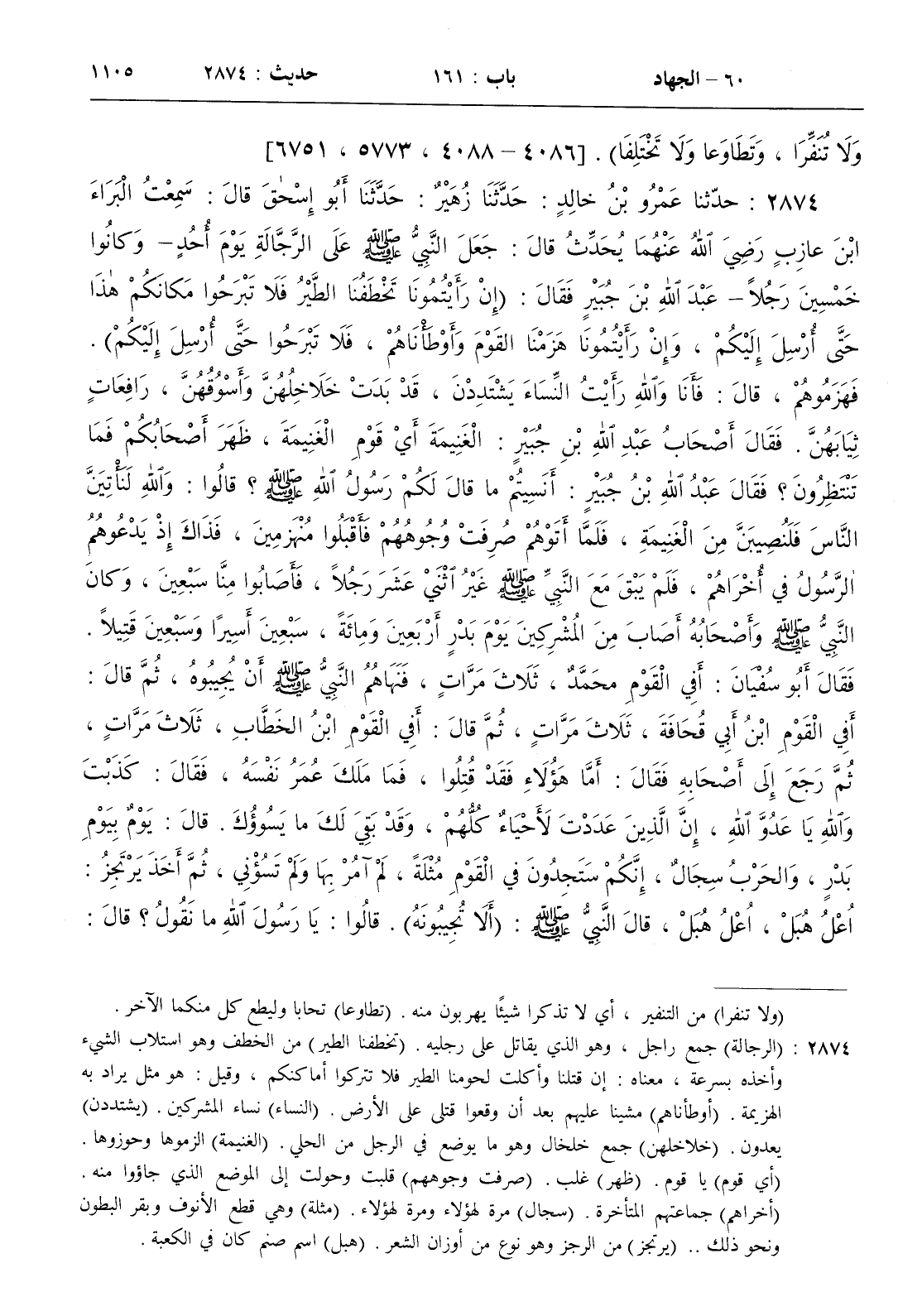 : جعل النبي صلى الله عليه و سلم على الرجالة يوم أحد - وكانوا خمسين رجلا - عبد الله بن جبير فقال ( إن رأيتمونا تخطفنا الطير فلا تبرحوا مكانكم هذا حتى أرسل إليكم وإن رأيتمونا هزمنا القوم وأوطأناهم فلا تبرحوا حتى أرسل إليكم ) . فهزموهم قال فأنا والله رأيت النساء يشتددن قد بدت خلاخلهن وأسوقهن رافعات ثيابهن . فقال أصحاب عبد الله بن جبير الغنيمة أي قوم الغنيمة ظهر أصحابكم فما تنتظرون ؟ فقال عبد الله ابن جبير أنسيتم ما قال لكم رسول الله صلى الله عليه و سلم ؟ قالوا والله لنأتين الناس فلنصيبن من الغنيمة فلما أتوهم صرفت وجوههم فأقبلوا منهزمين فذاك إذ يدعوهم الرسول في أخراهم فلم يبق مع النبي صلى الله عليه و سلم غير اثني عشر رجلا فأصابوا منا سبعين وكان النبي صلى الله عليه و سلم وأصحابه أصاب من المشركين يوم بدر أربعين ومائة سبعين أسيرا وسبعين قتيلا . فقال أبو سفيان أفي القوم محمد ثلاث مرات فنهاهم النبي صلى الله عليه و سلم أن يجيبوه ثم قال أفي القوم ابن أبي قحافة ثلاث مرات ثم قال أفي القوم ابن الخطاب ثلاث مرات ثم رجع إلى أصحابه فقال أما هؤلاء فقد قتلوا فما ملك عمر نفسه فقال كذبت والله يا عدو الله إن الذين عددت أحياء كلهم وقد بقي لك ما يسؤوك . قال يوم بيوم بدر والحرب سجال إنكم ستجدون في القوم مثلة لم آمر بها ولم تسؤني ثم أخذ يرتجز اعل هبل اعل هبل قال النبي صلى الله عليه و سلم ( ألا تجيبونه ) . قالوا يا رسول الله ما نقول ؟ قال ( قولوا الله أعلى وأجل ) . قال إن لنا العزى ولا عزى لكم فقال النبي صلى الله عليه و سلم ( ألا تجيبونه ) . قال قالوا يا رسول الله ما نقول ؟ قال ( قولوا الله مولانا ولا مولى لكم )