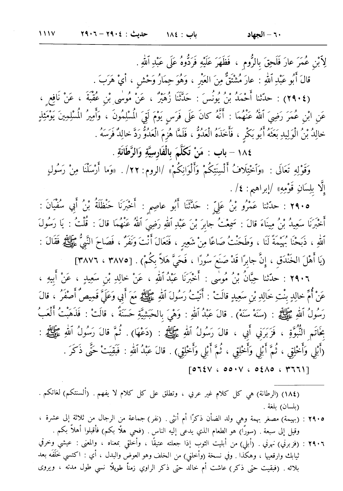 [ ش ( فزبرني ) نهرني . ( أبلي ) من أبليت الثوب إذا جعلته عتيقا وأخلقي بمعناه والمعنى عيشي وخرقي ثيابك وارقعيها وهكذا . وفي نسخة ( وأخلفي ) من الخلف وهو العوض والبدل أي اكتسبي خلفه بعد بلائه . ( فبقيت حتى ذكر ) عاشت أم خالد حتى ذكر الراوي زمنا طويلا نسي طول مدته ويروى ( حتى ذكرت ) أي صارت مذكورة عند الناس لخروجها عن العادة . وفي نسخة ( دكن ) من الدكنة وهي غبرة أي اسود لونه من طول ما لبس ]