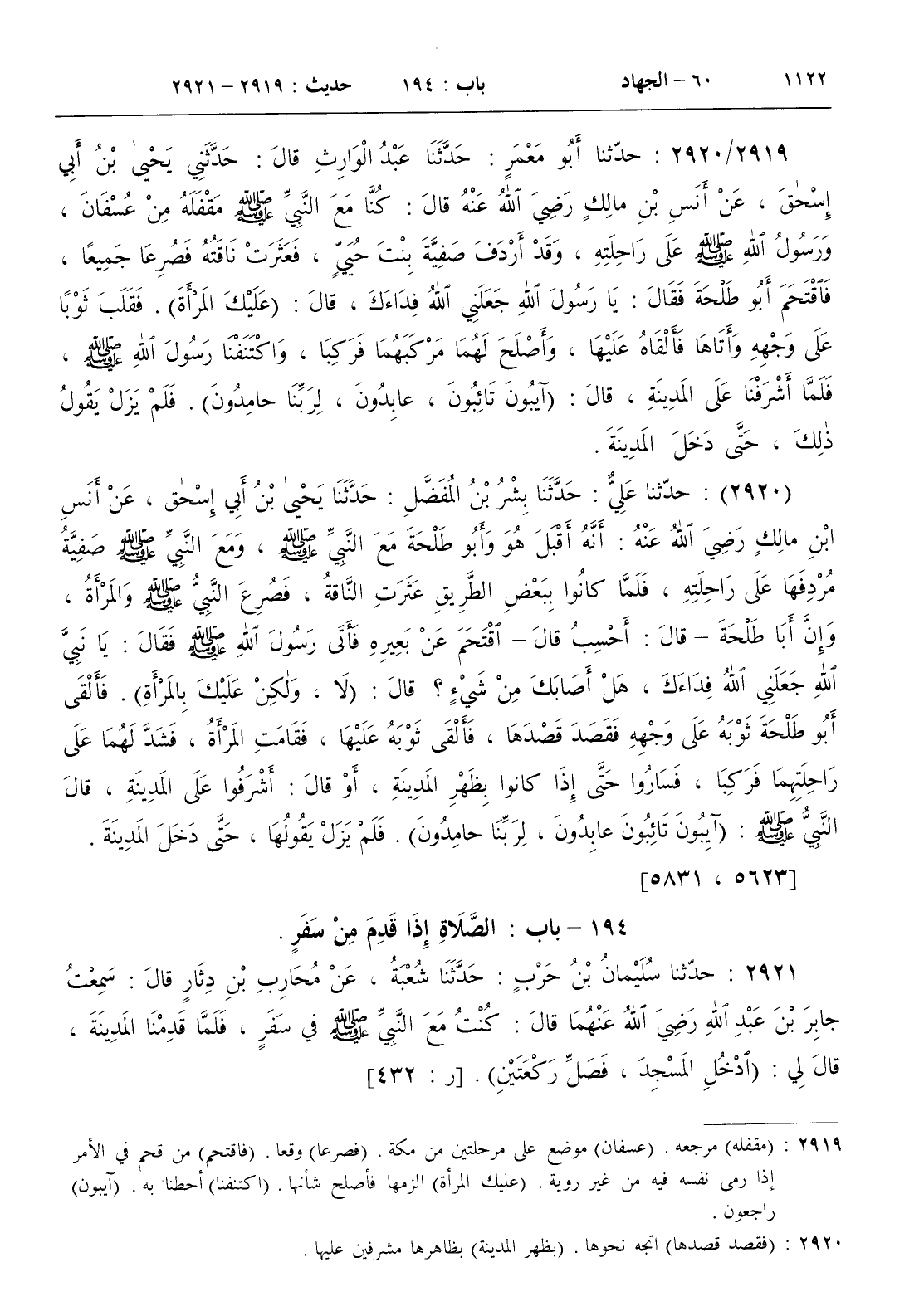 : كنا مع النبي صلى الله عليه و سلم مقفله من عسفان ورسول الله صلى الله عليه و سلم على راحلته وقد أردف صفية بنت حيي فعثرت ناقته فصرعا جميعا فاقتحم أبو طلحة فقال يا رسول الله جعلني الله فداءك قال ( عليك المرأة ) . فقلب ثوبا على وجهه وأتاها فألقاه عليها وأصلح لهما مركبهما فركبا واكتنفنا رسول الله صلى الله عليه و سلم فلما أشرفنا على المدينة قال ( آيبون تائبون عابدون لربنا حامدون ) . فلم يزل يقول ذلك حتى دخل المدينة