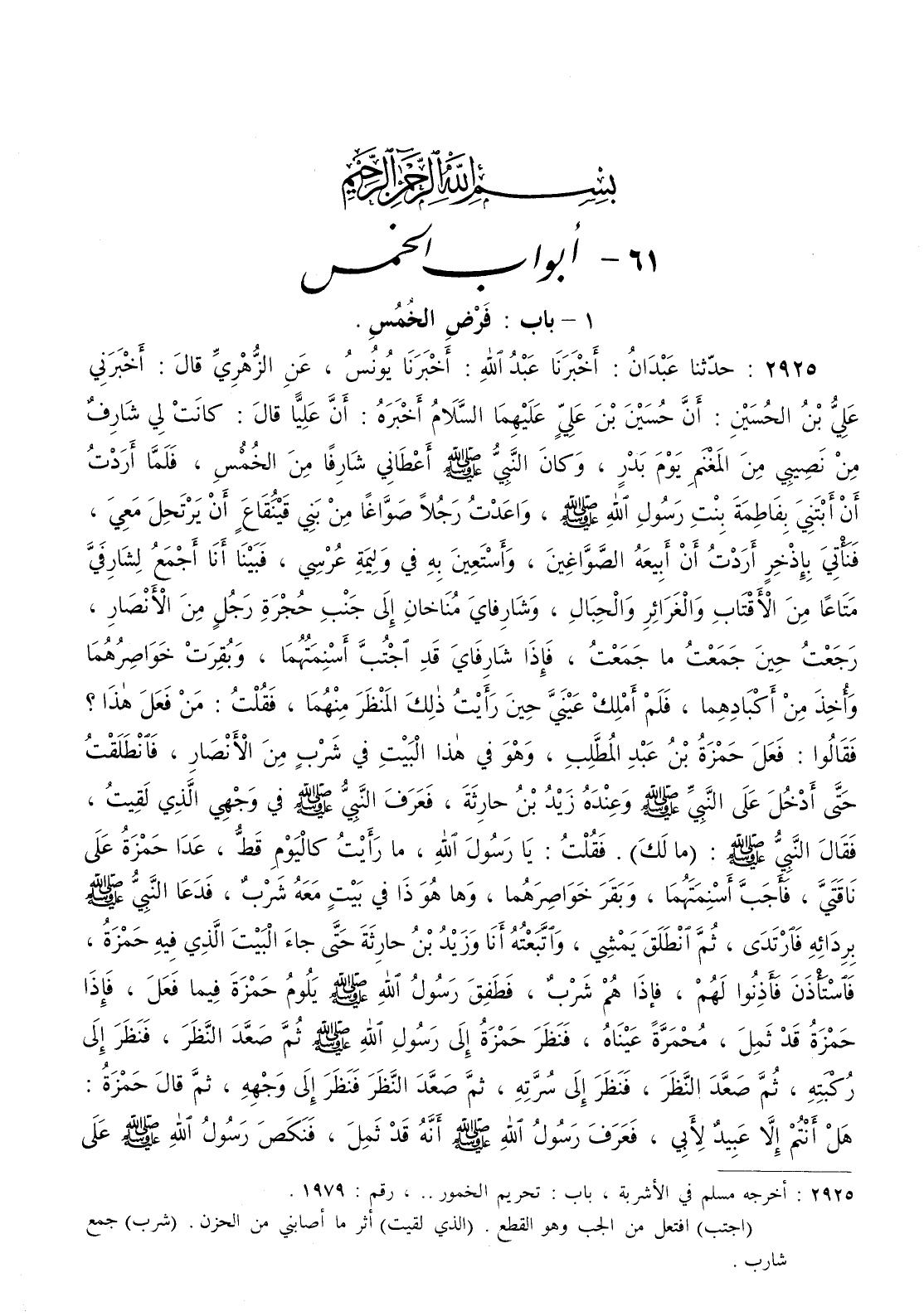 معه شرب فدعا النبي صلى الله عليه و سلم بردائه فارتدى ثم انطلق يمشي واتبعته أنا وزيد بن حارثة حتى جاء البيت الذي فيه حمزة فاستأذن فأذنوا لهم فإذا هم شرب فطفق رسول الله صلى الله عليه و سلم يلوم حمزة فيما فعل فإذا حمزة قد ثمل محمرة عيناه فنظر حمزة إلى رسول الله صلى الله عليه و سلم ثم صعد النظر فنظر إلى ركبته ثم صعد النظر فنظر إلى سرته ثم صعد النظر فنظر إلى وجهه ثم قال حمزة هل أنتم إلا عبيد لأبي فعرف رسول الله صلى الله عليه و سلم أنه قد ثمل فنكص رسول الله صلى الله عليه و سلم على عقبيه القهقرى وخرجنا معه