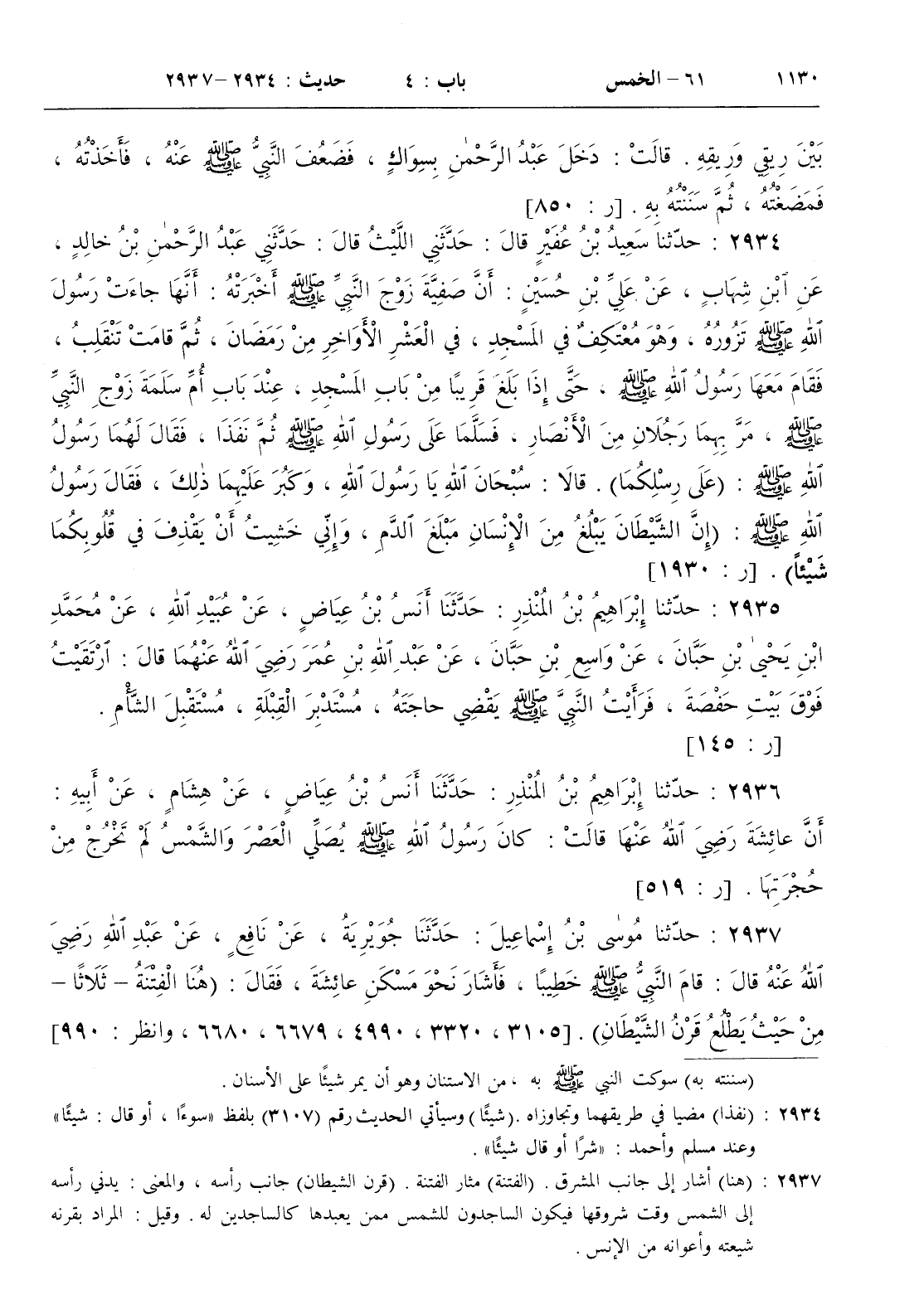 2934 - حدثنا سعيد بن عفير قال حدثني الليث قال حدثني عبد الرحمن ابن خالد عن ابن شهاب عن علي بن حسين أن صفية زوج النبي صلى الله عليه و سلم أخبرته
