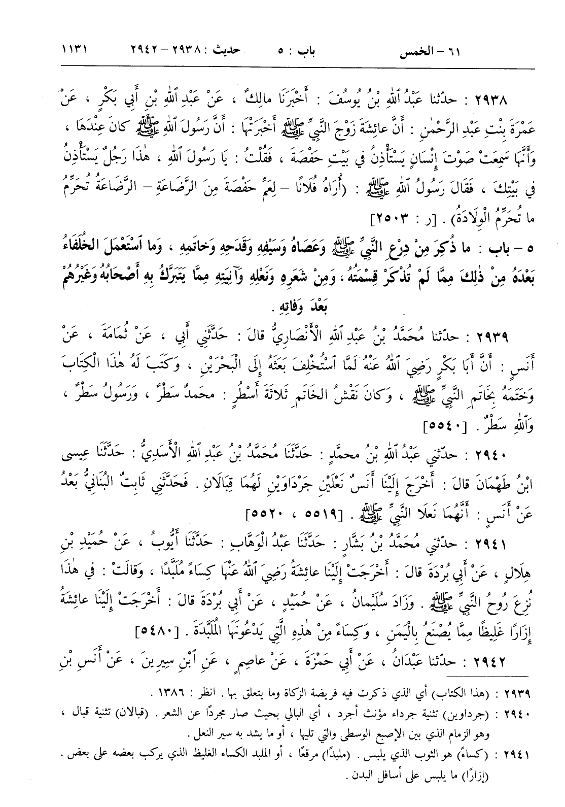 5 - باب ما ذكر من درع النبي صلى الله عليه و سلم وعصاه وسيفه وقدحه وخاتمه وما استعمل الخلفاء بعده من ذلك مما لم تذكر قسمته ومن شعره ونعله وآنيته مما يتبرك به أصحابه وغيرهم بعد وفاته