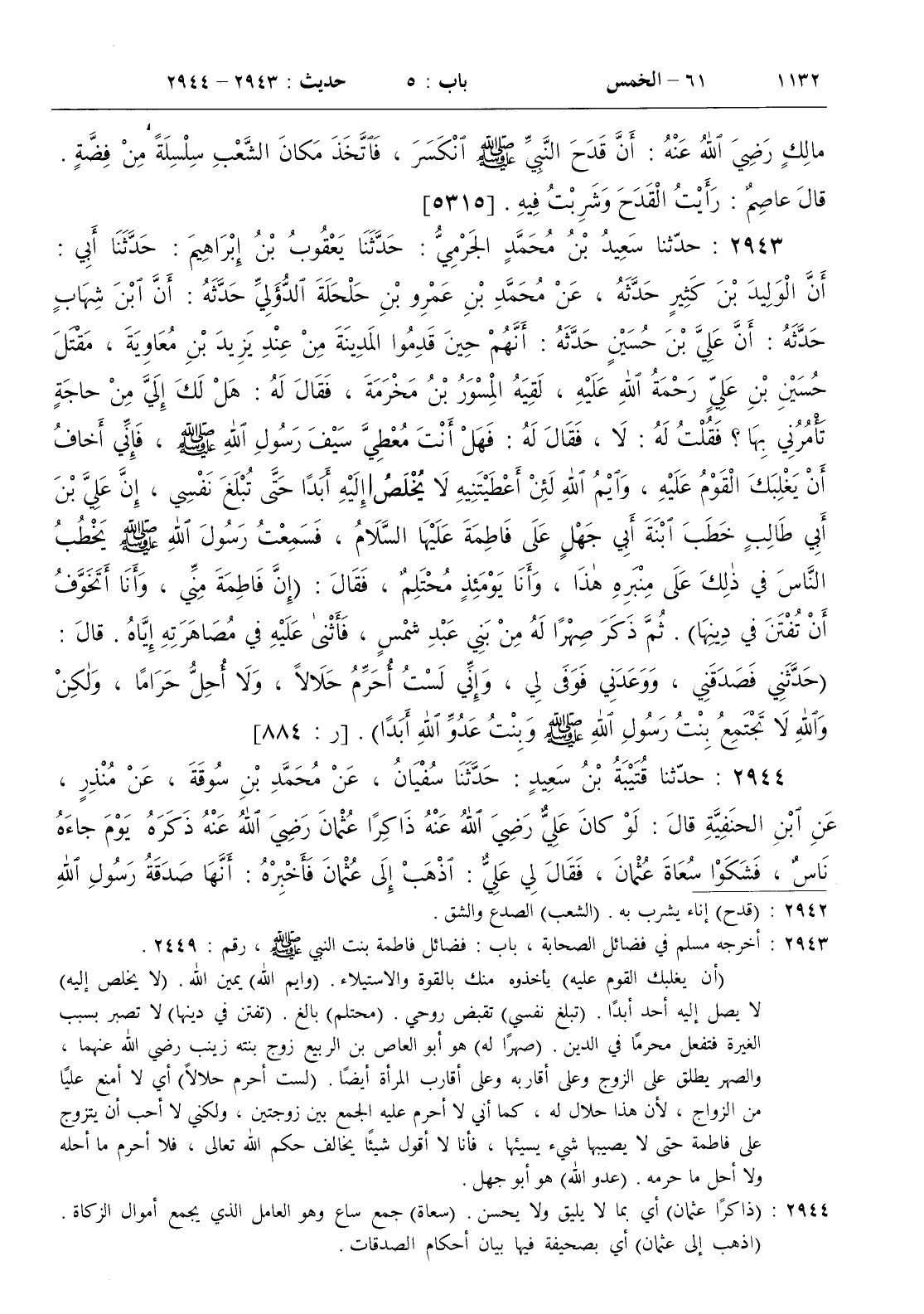 2943 - حدثنا سعيد بن محمد الجرمي حدثنا يعقوب بن إبراهيم حدثنا أبي أن الوليد بن كثير حدثه عن محمد بن عمرو بن حلحلة الدؤلي حدثه أن ابن شهاب حدثه أن علي بن حسين حدثه