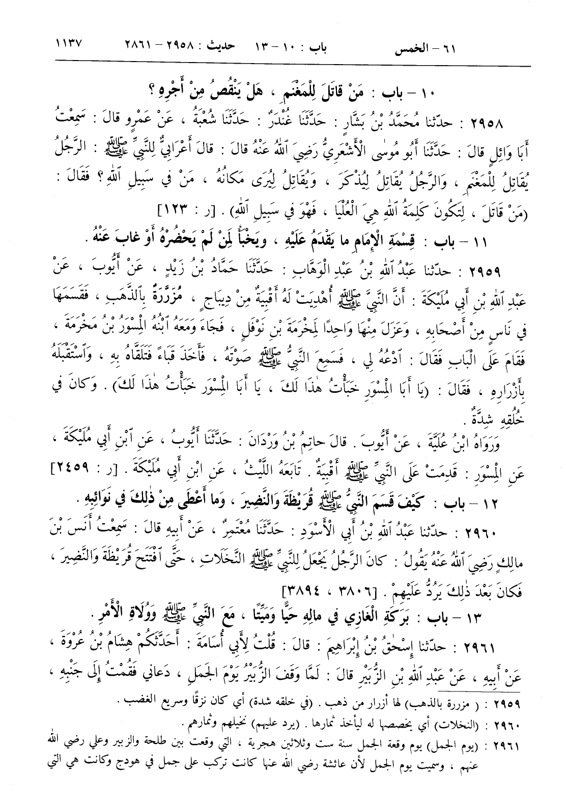 [ ش ( يوم الجمل ) يوم وقعة الجمل سنة ست وثلاثين هجرية التي وقعت بين طلحة والزبير وعلي رضي الله عنهم وسميت يوم الجمل لأن عائشة رضي الله عنها كانت تركب على جمل في هودج وكانت هي التي خرجت بالناس وكانت هي محور المعركة رضي الله عنها وعفا عنها وعمن شجعها وأغراها بهذا الموقف . ( وثلثه لبنيه ) أي أوصى بثلث الثلث لبني عبد الله خاصة . ( وازى ) حاذاهم وساواهم في السن . ( الغابة ) أرض شهيرة من عوالي المدينة كان الزبير قد اشتراها . ( لا ولكنه سلف ) أي لا أضعه عندي وديعة ولكني آخذه دينا وذلك حتى يكون مضمونا عليه إذا أصابه شيء من التلف . ( فكتمه ) كتم أصل الدين حتى لا يستعظمه حكيم فينظر إليه بعين الاحتياج ولكنه لما استعظم القليل أخبره بالحقيقة . ( فليوافنا ) فليأتنا . ( بالموسم ) موسم الحج سمي بذلك لاجتماع الناس فيه فهو معلم مأخوذ من الوسم وهو العلامة ]