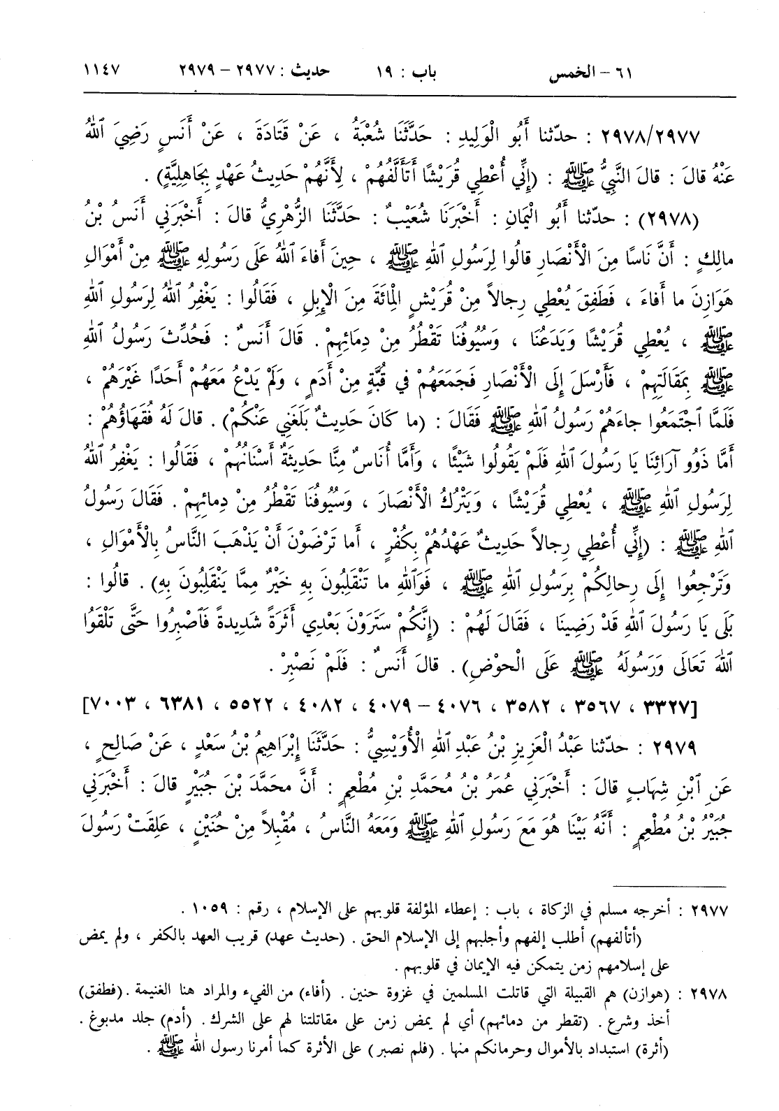 [ ش أخرجه مسلم في الزكاة باب إعطاء المؤلفة قلوبهم على الإسلام رقم 1059 . ( أتألفهم ) أطلب إلفهم وأجلبهم إلى الإسلام الحق . ( حديث عهد ) قريب العهد بالكفر ولم يمض على إسلامهم زمن يتمكن فيه الإيمان في قلوبهم ]