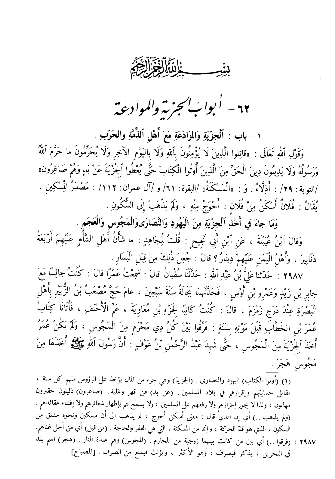 : كنت جالسا مع جابر بن زيد وعمرو بن أوس فحدثهما بجالة سنة سبعين عام حج مصعب بن الزبير بأهل البصرة عند درج زمزم قال كنت كاتبا لجزء بن معاوية عن الأحنف فأتانا كتاب عمر بن الخطاب قبل موته بسنة فرقوا بين كل ذي محرم من المجوس ولم يكن عمر أخذ الجزية من المجوس حتى شهد عبد الرحمن بن عوف أن رسول الله صلى الله عليه و سلم أخذها من مجوس هجر