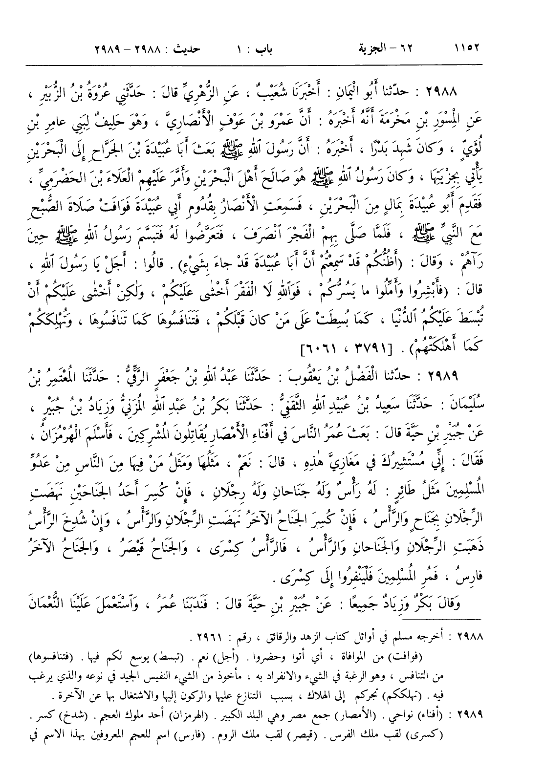 : أن رسول الله صلى الله عليه و سلم بعث أبا عبيدة بن الجراح إلى البحرين يأتي بجزيتها وكان رسول الله صلى الله عليه و سلم هو صالح أهل البحرين وأمر عليهم العلاء بن الحضرمي فقدم أبو عبيدة بمال من البحرين فسمعت الأنصار بقدوم أبي عبيدة فوافت صلاة الصبح مع النبي صلى الله عليه و سلم فلما صلى بهم الفجر انصرف فتعرضوا له فتبسم رسول الله صلى الله عليه و سلم حين رآهم وقال ( أظنكم قد سمعتم أن أبا عبيدة قد جاء بشيء ) . قالوا أجل يا رسول الله قال ( فأبشروا وأملوا ما يسركم فوالله لا الفقر أخشى عليكم ولكن أخشى عليكم أن تبسط عليكم الدنيا كما بسطت على من كان قبلكم فتنافسوها كما تنافسوها وتهلككم كما أهلكتهم )