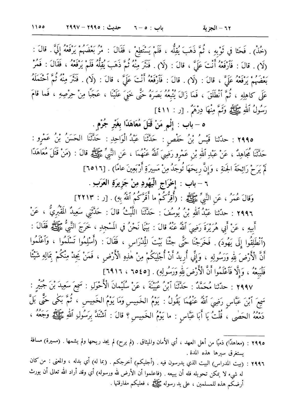 : بينما نحن في المسجد خرج النبي صلى الله عليه و سلم فقال ( انطلقوا إلى يهود ) . فخرجنا حتى جئنا بيت المدارس فقال ( أسلموا تسلموا واعلموا أن الأرض لله ورسوله وإني أريد أن أجليكم من هذه الأرض فمن يجد منكم بماله شيئا فليبعه وإلا فاعلموا أن الأرض لله ورسوله )