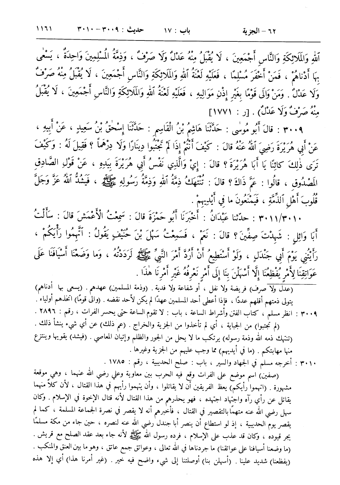 [ ش أخرجه مسلم في الجهاد والسير باب صلح الحديبية رقم 1785 . ( صفين ) اسم موضع على الفرات وقع فيه الحرب بين معاوية وعلي رضي الله عنهما وهي موقعة مشهورة . ( اتهموا رأيكم ) يعظ الفريقين أن لا يقاتلوا وأن يتهموا رأيهم في هذا القتال لأن كلا منهما يقاتل عن رأي رآه واجتهاد اجتهده فهو يحذرهم من هذا القتال لأنه قتال الإخوة في الإسلام وكان سهل رضي الله عنه متهما بالتقصير في القتال فأخبرهم أنه لا يقصر في نصرة الجماعة المسلمة كما لم يقصر يوم الحديبية إذ لو استطاع أن ينصر أبا جندل رضي الله عنه لنصره حين جاء من مكة مسلما يجر قيوده وكان قد عذب على الإسلام فرده رسول الله صلى الله عليه و سلم لأنه جاء بعد عقد الصلح مع قريش . ( ما وضعنا أسيافنا على عواتقنا ) ما جردناها في الله تعالى وعواتق جمع عاتق وهو ما بين العنق والمنكب . ( يفظعنا ) شديد علينا . ( أسهلن بنا ) أوصلتنا إلى شيء واضح فيه خير . ( غير أمرنا هذا ) أي إلا هذه الفتنة التي وقعت بين المسلمين فإنها مشكلة علينا فلا ندري على أي شيء يقتل المسلمون فنزع السيف وغمده في هذا الموطن أولى من سله ]