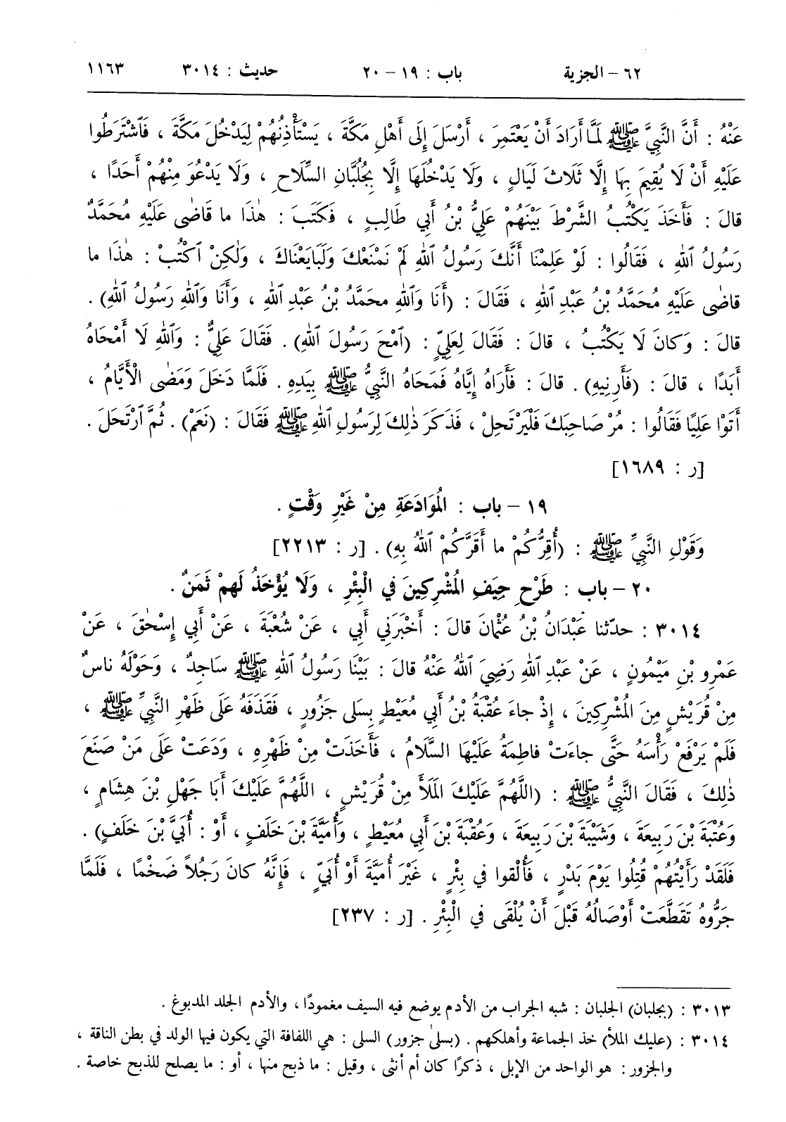 : بينا رسول الله صلى الله عليه و سلم ساجد وحوله ناس من قريش من المشركين إذ جاء عقبة بن أبي معيط بسلى جزور فقذفه على ظهر النبي صلى الله عليه و سلم فلم يرفع رأسه حتى جاءت فاطمة عليها السلام فأخذت من ظهره ودعت على من صنع ذلك فقال النبي صلى الله عليه و سلم ( اللهم عليك الملأ من قريش اللهم عليك أبا جهل بن هشام وعتبة ابن ربيعة وشيبة بن ربيعة وعقبة بن أبي معيط وأمية بن خلف أو أبي ابن خلف ) . فلقد رأيتهم قتلوا يوم بدر فألقوا في بئر غير أمية وأبي فإنه كان رجلا ضخما فلما جروه تقطعت أوصاله قبل أن يلقى في البئر