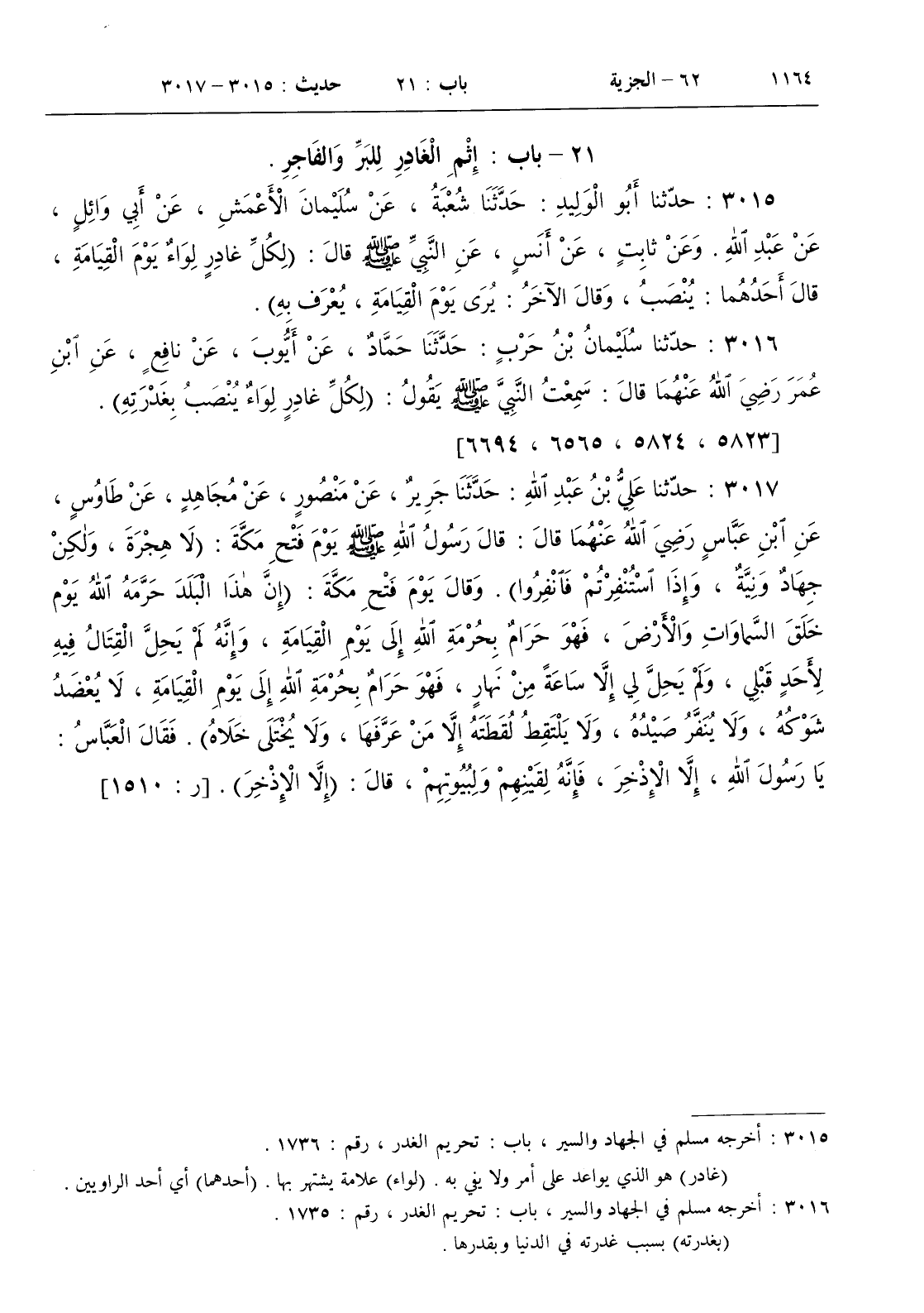 [ ش أخرجه مسلم في الجهاد والسير باب تحريم الغدر رقم 1736 . ( غادر ) هو الذي يواعد على أمر ولا يفي به . ( لواء ) علامة يشتهر بها . ( أحدهما ) أي أحد الراويين ]