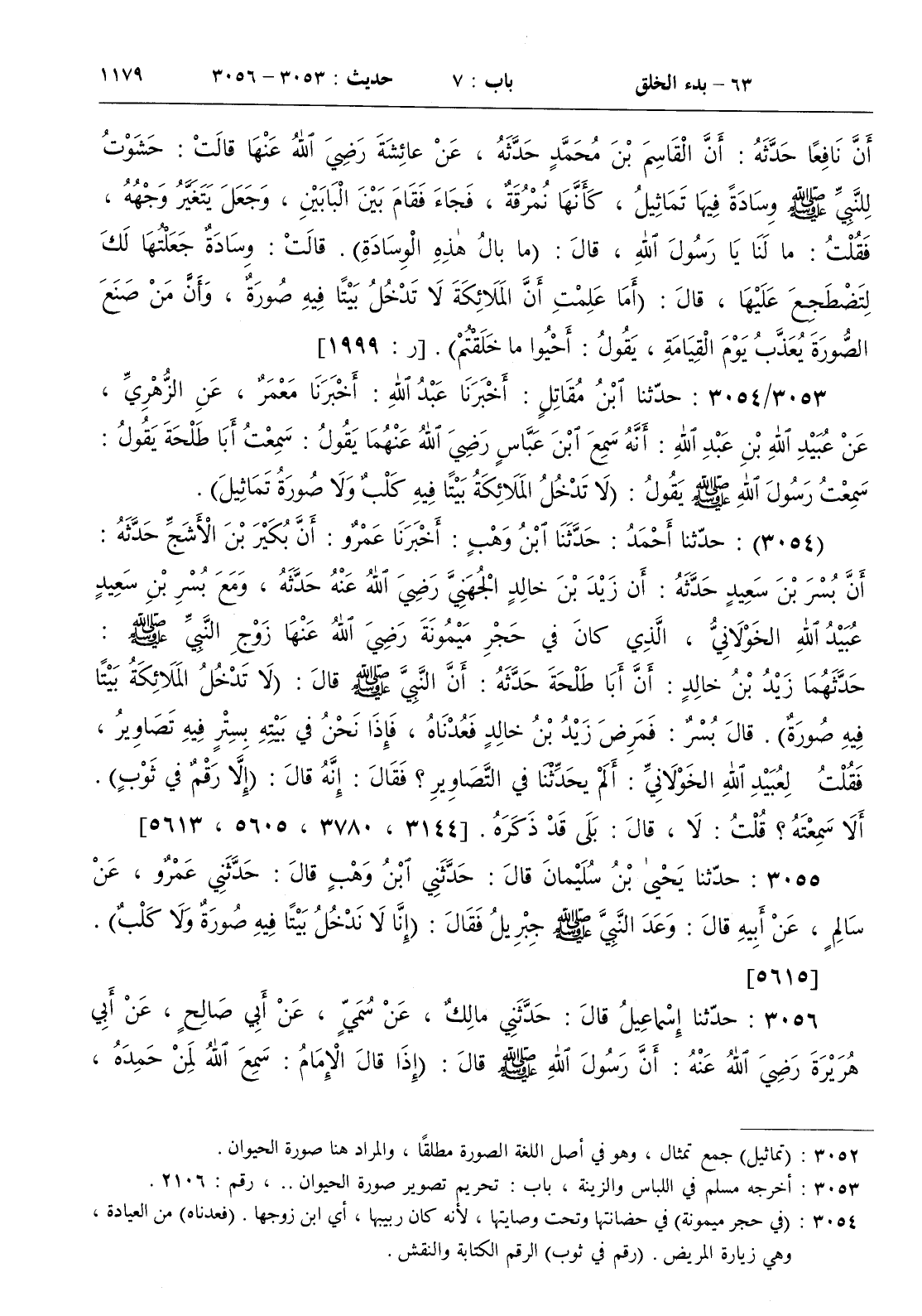 : أن النبي صلى الله عليه و سلم قال ( لا تدخل الملائكة بيتا فيه صورة ) . قال بسر فمرض زيد بن خالد فعدناه فإذا نحن في بيته بستر فيه تصاوير فقلت لعبيد الله الخولاني ألم يحدثنا في التصاوير ؟ فقال إنه قال ( إلا رقم في ثوب ) . ألا سمعته ؟ قلت لا قال بلى قد ذكره