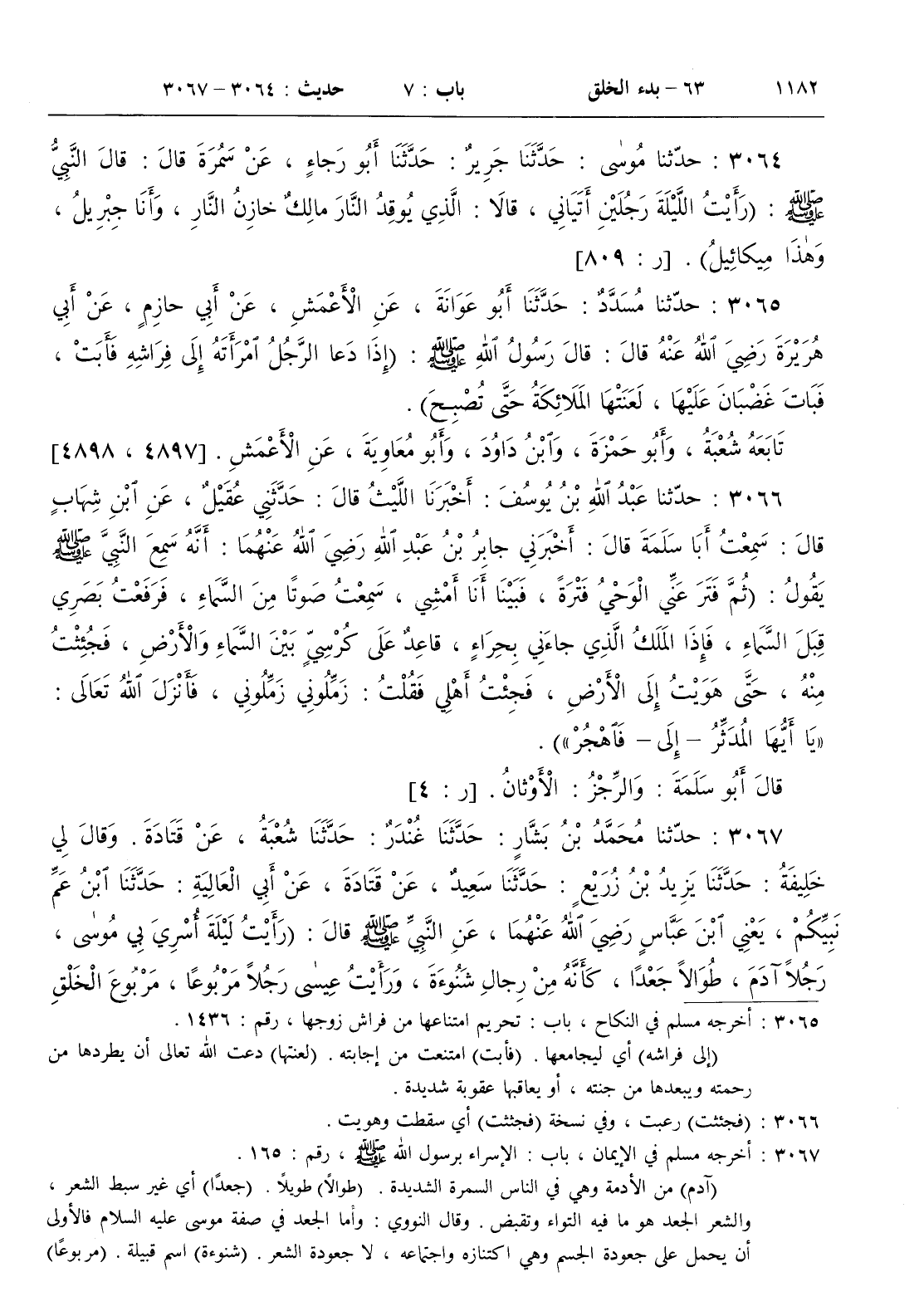[ ش أخرجه مسلم في الإيمان باب الإسراء برسول الله صلى الله عليه و سلم رقم 165 . ( آدم ) من الأدمة وهي في الناس السمرة الشديدة . ( طوالا ) طويلا . ( جعدا ) غير سبط الشعر والشعر الجعد هو ما فيه التواء وتقبض . ( وقال النووي وأما الجعد في صفة موسى عليه السلام فالأولى أن يحمل على جعودة الجسم وهي اكتنازه واجتماعه لا جعودة الشعر . ( شنوءة ) اسم قبيلة . ( مربوعا ) لا قصيرا ولا طويلا . ( مربوع الخلق ) معتدل الخلقة مائلا إلى الحمرة . ( سبط الرأس ) مسترسل الشعر . ( والدجال ) أي ورأيت الدجال . ( آيات ) علامات ودلائل . ( إياه ) أي النبي صلى الله عليه و سلم ووضع إياه موضع إياي على سبيل الالتفات . ( مرية ) شك . ( لقائه ) أي لقاء موسى عليه السلام وقيل غير ذلك / السجدة 23 / ]