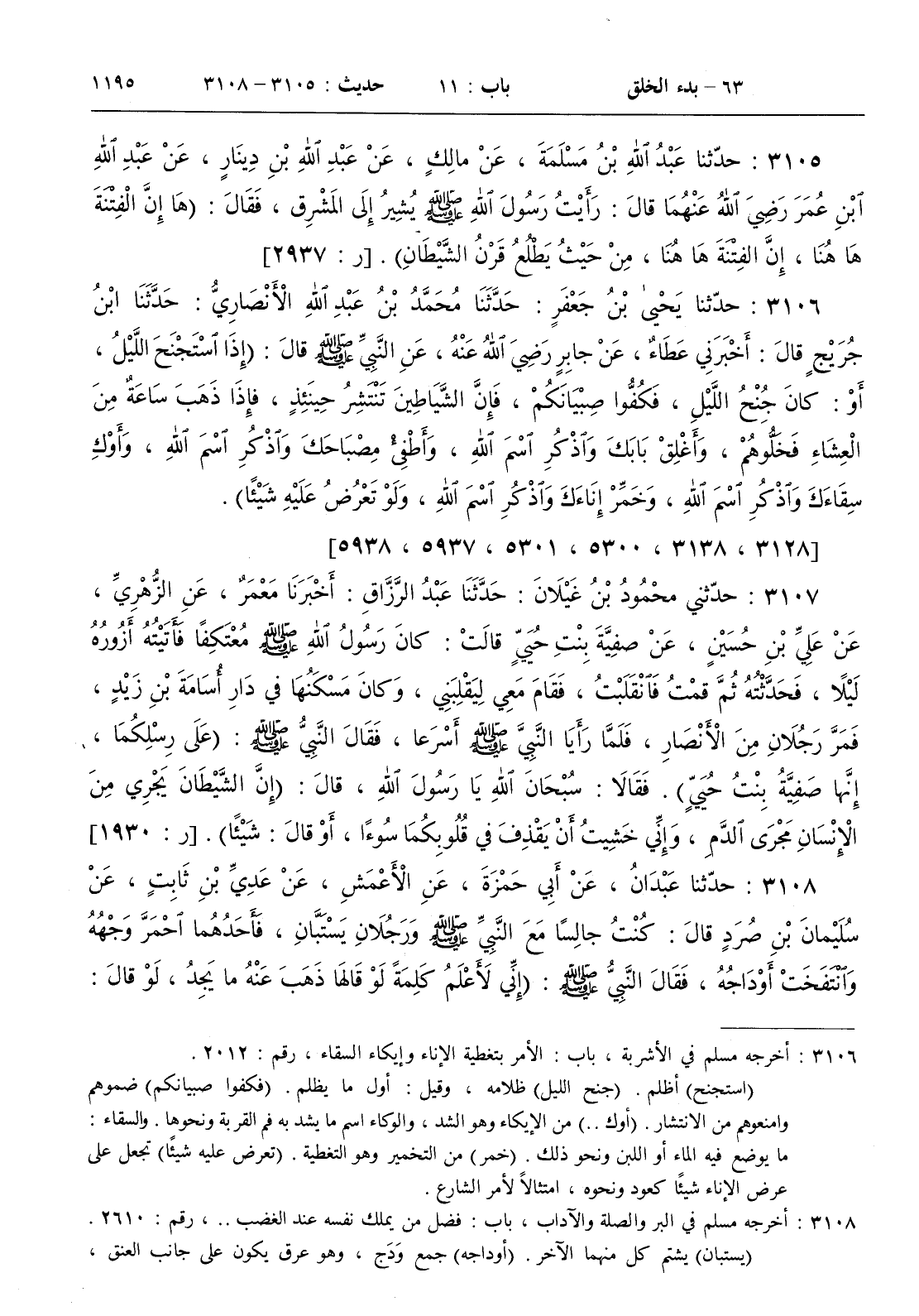 : عن النبي صلى الله عليه و سلم قال ( إذا استنجح الليل أو كان جنح الليل فكفوا صبيانكم فإن الشياطين تنتشر حينئذ فإذا ذهب ساعة من العشاء فخلوهم وأغلق بابك واذكر اسم الله وأطفئ مصباحك واذكر اسم الله وأوك سقاءك واذكر اسم الله وخمر إناءك واذكر اسم الله ولو تعرض عليه شيئا )