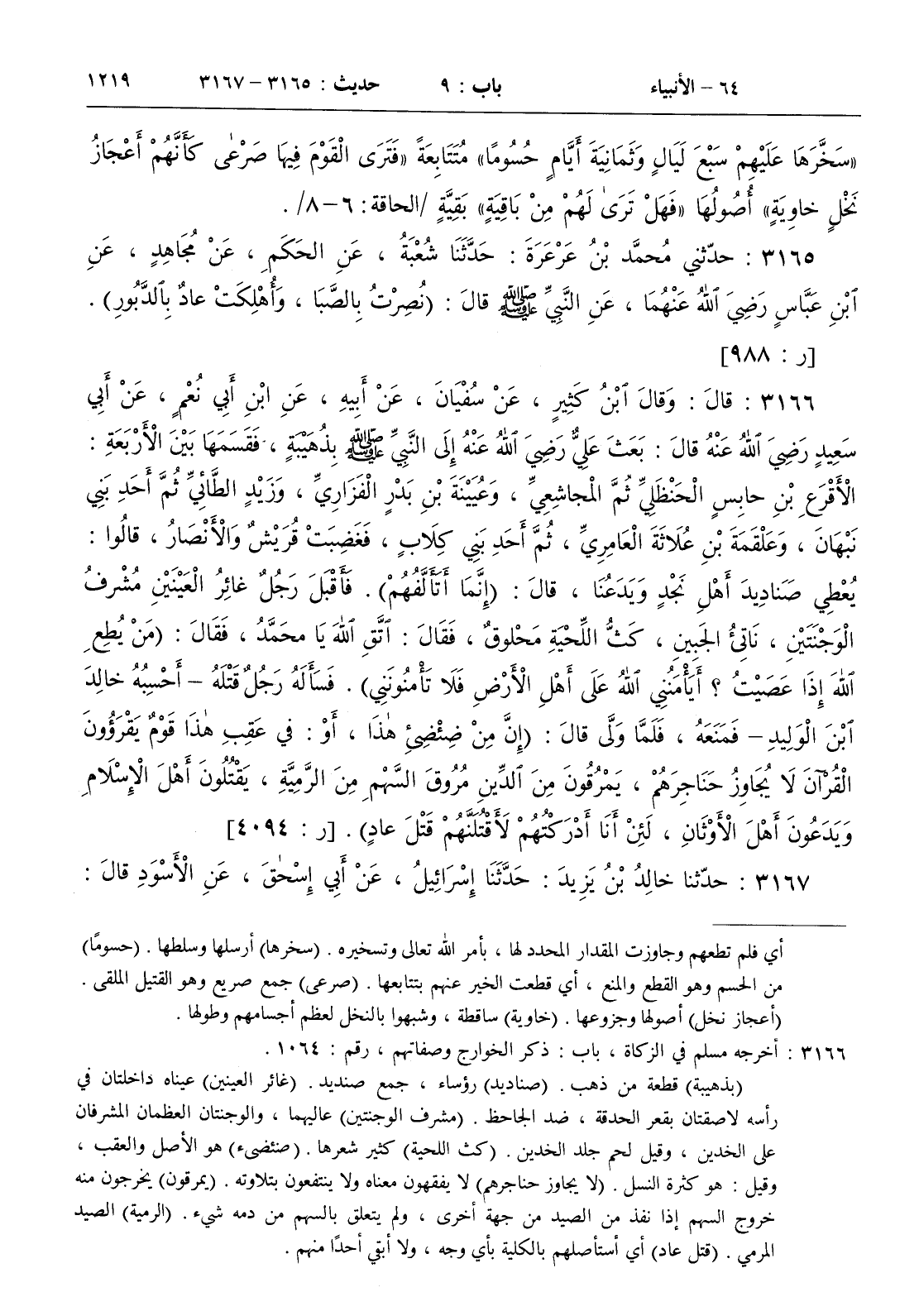 [ ش أخرجه مسلم في الزكاة باب ذكر الخوارج وصفاتهم رقم 1064 . ( بذهبية ) قطعة من ذهب . ( صناديد ) رؤساء جمع صنديد . ( غائر العنين ) عيناه داخلتان في رأسه لاصقتان بقعر الحدقة ضد الجاحظ . ( مشرف الوجنتين ) عاليهما والوجنتان العظمان المشرفان على الخدين وقيل لحم جلد الخدين . ( كث اللحية ) كثير شعرها . ( ضئضئ ) هو الأصل والعقب وقيل هو كثرة النسل . ( لا يجاوز حناجرهم ) لا يفقهون معناه ولا ينتفعون بتلاوته . ( يمرقون ) يخرجون منه خروج السهم إذا نفذ من الصيد من جهة أخرى ولم يتعلق بالسهم من دمه شيء . ( الرمية ) الصيد المرمي . ( قتل عاد ) أي أستأصلهم بالكلية بأي وجه ولا أبقي أحدا منهم ]