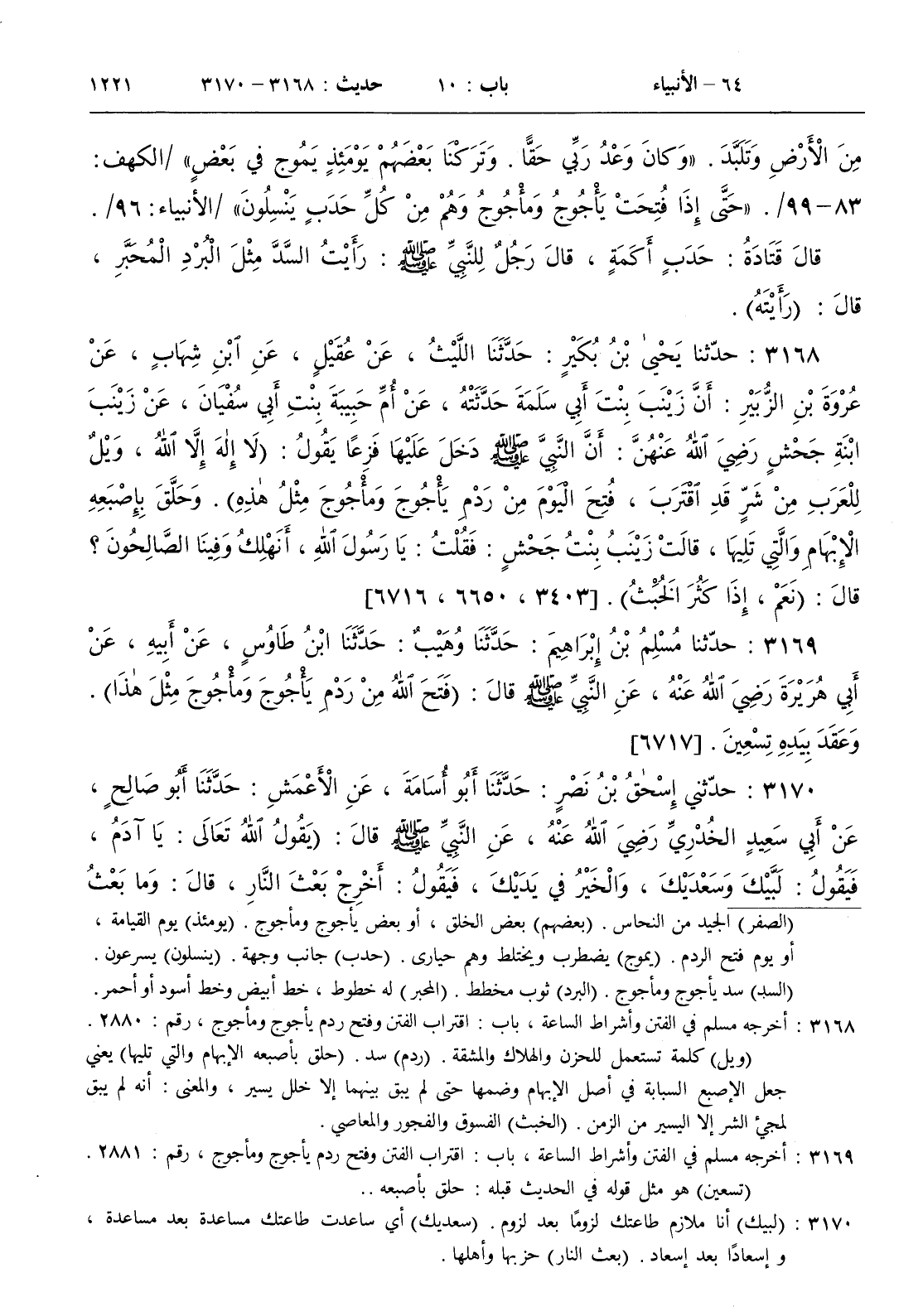 : أن النبي صلى الله عليه و سلم دخل عليها فزعا يقول ( لا إله إلا الله ويل للعرب من شر اقترب فتح اليوم من ردم يأجوج ومأجوج مثل هذه ) . وحلق بإصبعه الإبهام والتي تليها قالت زينب بنت جحش فقلت يا رسول الله أنهلك وفينا الصالحون ؟ قال ( نعم إذا كثر الخبث )