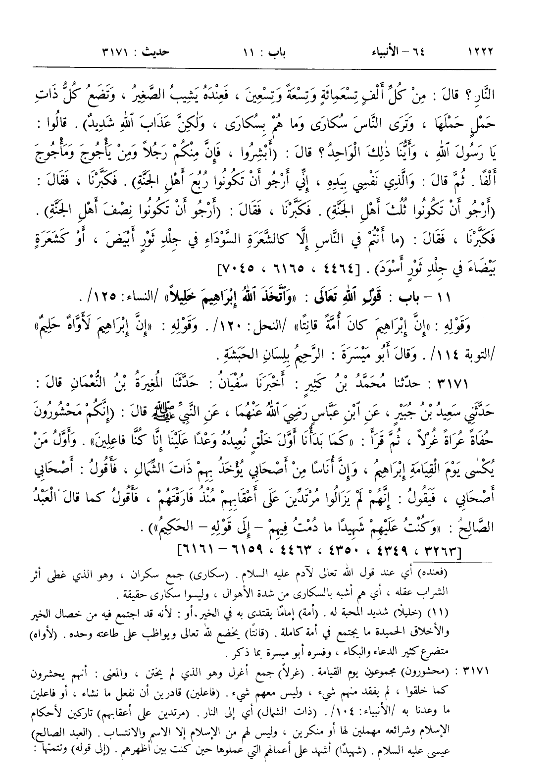 : عن النبي صلى الله عليه و سلم قال ( إنكم محشورون حفاة عراة غرلا ثم قرأ { كما بدأنا أول خلق نعيده وعدا علينا إنا كنا فاعلين } . وأول من يكسى يوم القيامة إبراهيم وإن إناسا من أصحابي يؤخذ بهم ذات الشمال فأقول أصحابي أصحابي فيقول إنهم لم يزالوا مرتدين على أعقابهم منذ فارقتهم فأقول كما قال العبد الصالح { وكنت عليهم شهيدا ما دمت فيهم - إلى قوله - الحكيم } )