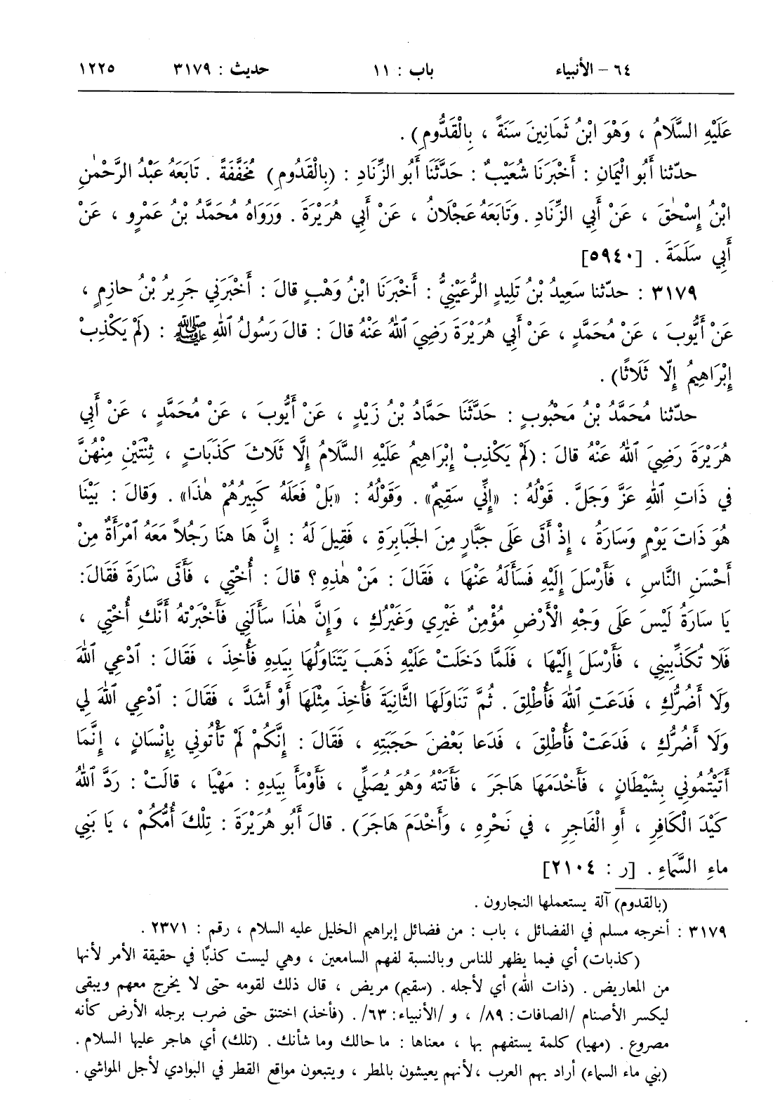 [ ش أخرجه مسلم في الفضائل باب من فضائل إبراهيم الخليل عليه السلام رقم 2371 . ( كذبات ) أي فيما يظهر للناس وبالنسبة لفهم السامعين وهي ليست كذبا في حقيقة الأمر لأنها من المعاريض . ( ذات الله ) أي لأجله . ( سقيم ) مريض قال ذلك لقومه حتى لا يخرج معهم ويبقى ليكسر الأصنام / الصافات 89 / و / الأنبياء 63 / . ( فأخذ ) اختنق حتى ضرب برجله الأرض كأنه مصروع . ( مهيا ) كلمة يستفهم بها معناها ما حالك وما شأنك . ( تلك ) أي هاجر عليها السلام . ( بني ماء السماء ) أراد بهم العرب لأنهم يعيشون بالمطر ويتبعون مواقع القطر في البوادي لأجل المواشي ]