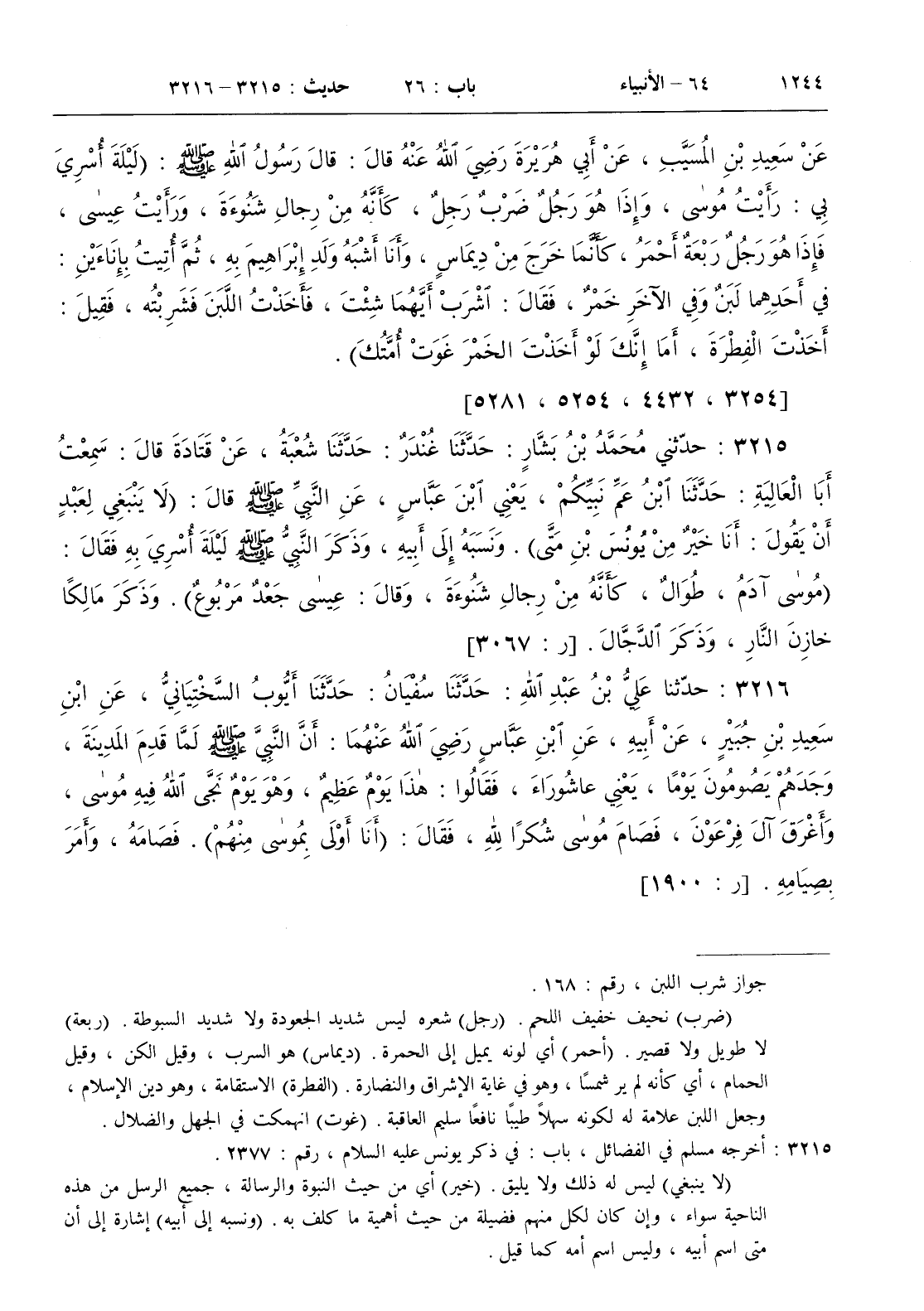 : عن النبي صلى الله عليه و سلم قال ( لا ينبغي لعبد أن يقول أنا خير من يونس بن متى ) . ونسبه إلى أبيه وذكر النبي صلى الله عليه و سلم ليلة أسري به فقال ( موسى آدم طوال كأنه من رجال شنوءة وقال عيسى جعد مربوع ) . وذكر مالكا خازن النار وذكر الدجال