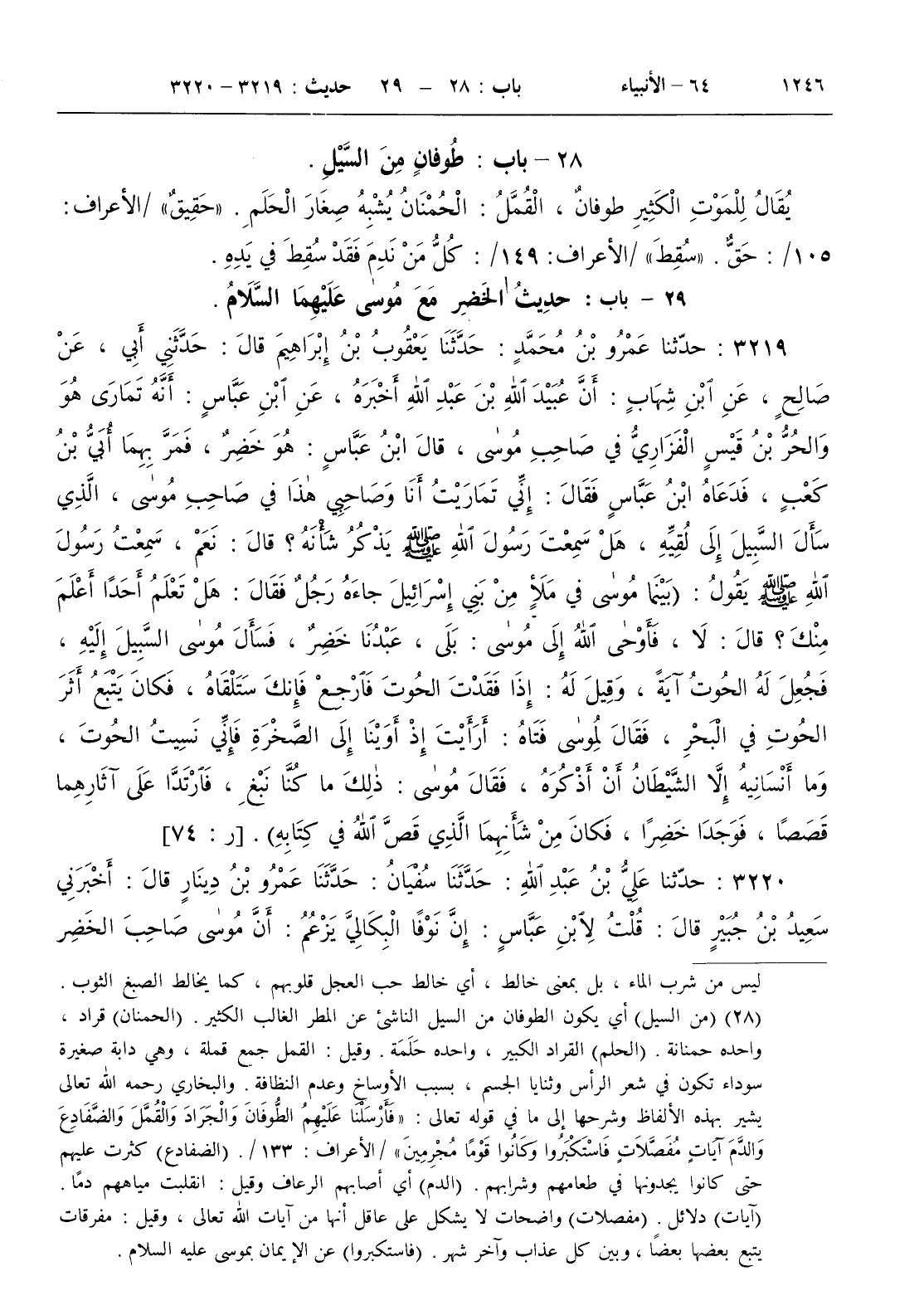: عن النبي صلى الله عليه و سلم ( أن موسى قام خطيبا في بني إسرائيل فسئل أي الناس أعلم ؟ فقال أنا فعتب الله عليه إذ لم يرد العلم إليه فقال له بلى لي عبد بمجمع البحرين هو أعلم منك قال أي رب ومن لي به ؟ وربما قال سفيان أي رب وكيف لي به ؟ قال تأخذ حوتا فتجعله في مكتل حيثما فقدت الحوت فهو ثم وربما قال فهو ثمه وأخذ حوتا فجعله في مكتل ثم انطلق هو وفتاه يوسع بن نون حتى أتيا الصخرة وضعا رؤوسهما فرقد موسى واضطرب الحوت فخرج فسقط في البحر فاتخذ سبيله في البحر سربا فأمسك الله عن الحوت جرية الماء فصار مثل الطاق فقال هكذا مثل الطاق فانطلقا يمشيان بقية ليلتهما ويومهما حتى إذا كان من الغد قال لفتاه آتنا غداءنا لقد لقينا من سفرنا هذا نصبا ولم يجد موسى النصب حتى جاوز حيث أمره الله قال له فتاه أرأيت إذ أوينا إلى الصخرة فإني نسيت الحوت وما أنسانيه إلا الشيطان أن أذكره واتخذ سبيله في البحر عجبا فكان للحوت سربا ولهما عجبا قال له موسى ذلك ما كنا نبغي فارتدا على آثارهما قصصا رجعا يقصان آثارهما حتى انتهينا إلى الصخرة فإذا رجل مسجى بثوب فسلم موسى فرد عليه فقال وأنى بأرضك السلام ؟ قال أنا موسى قال موسى بني إسرائيل ؟ قال نعم أتيتك لتعلمني مما علمت رشدا قال يا موسى إني على علم من علم الله علمنيه الله لا تعلمه وأنت على علم من علم الله علمكه الله لا أعلمه قال هل أتبعك ؟ قال { إنك لن تستطيع معي صبرا . وكيف تصبر على ما لم تحط به خبرا - إلى قوله - إمرا } . فانطلقا يمشيان على ساحل البحر فمرت بهما سفينة كلموهم أن يحملوهم فعرفوا الخضر فحملوه بغير نول فلما ركبا في السفينة جاء عصفور فوقع على حرف السفينة فنقر في البحر نقرة أو نقرتين قال له الخضر يا موسى ما نقص علمي وعلمك من علم الله إلا مثل ما نقص هذا العصفور بمنقاره من البحر إذ أخذ الفأس فنزع لوحا قال فلم يفجأ موسى إلا وقد قلع لوحا بالقدوم فقال له موسى ما صنعت ؟ قوم حملونا بغير نول عمدت إلى سفينتهم فخرقتها لتغرق أهلها لقد جئت شيئا إمرا قال ألم أقل إنك لن تستطيع معي صبرا قال لا تؤاخذني بما نسيت ولا ترهقني من أمري عسرا فكانت الأولى من موسى نسيانا فلما خرجا من البحر مروا بغلام يلعب مع الصبيان فأخذ الخضر برأسه فقلعه بيده هكذا وأومأ سفيان بأطراف أصابعه كأنه يقطف شيئا فقال له موسى أقتلت نفسا زكية بغير نفس لقد جئت شيئا نكرا . قال ألم أقل لك إنك لن تستطيع معي صبرا قال إن سألتك عن شيء بعدها فلا تصاحبني قد بلغت من لدني عذرا فانطلقا حتى إذا أتيا أهل قرية استطعما أهلها فأبوا أن يضيفوهما فوجدا فيها جدارا يريد أن ينقض مائلا أومأ بيده هكذا وأشار سفيان كأنه يمسح شيئا إلى فوق فلم أسمع سفيان يذكر مائلا إلا مرة قال قوم أتيناهم فلم يطعمونا ولم يضيفونا عمدت إلى حائطهم لو شئت لاتخذت عليه أجرا . قال هذا فراق بيني وبينك سأنبئك بتأويل ما لم تستطع عليه صبرا . قال النبي صلى الله عليه و سلم وددنا أن موسى كا نصبر فقص الله علينا من خبرهما قال سفيان قال النبي صلى الله عليه و سلم يرحم الله موسى لو كان صبر لقص علينا من أمرهما )