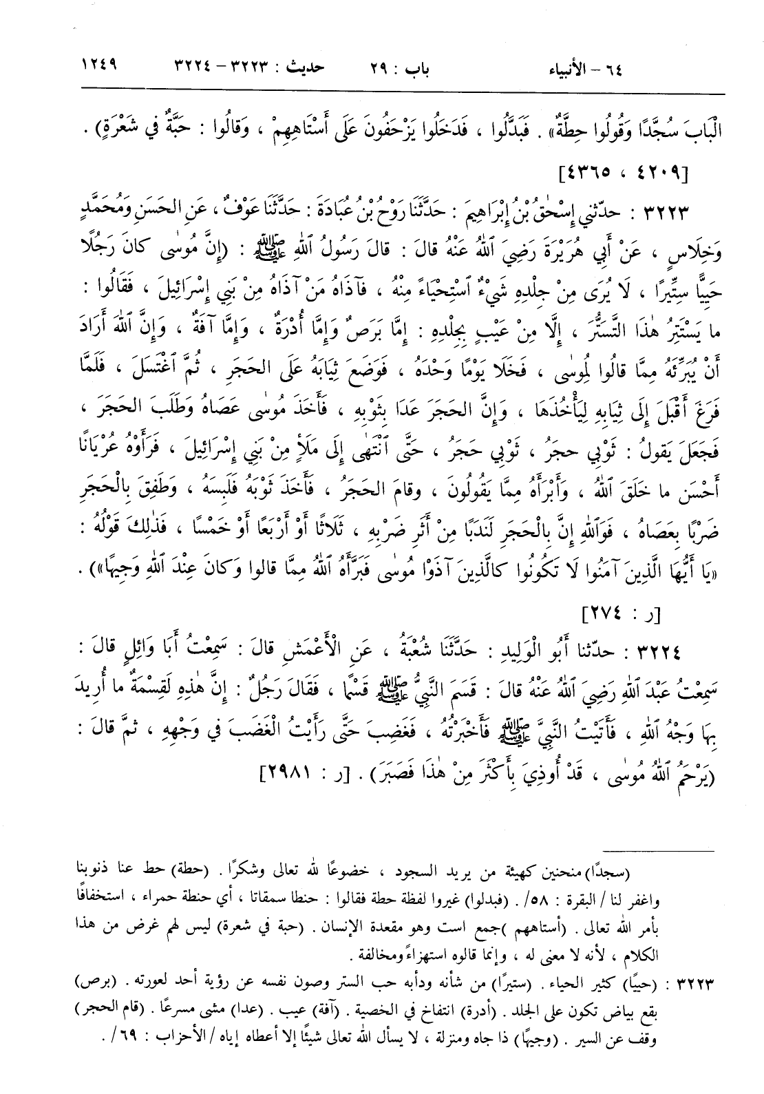 [ ش ( حييا ) كثير الحياء . ( ستيرا ) من شأنه ودأبه حب الستر وصون نفسه عن رؤية أحد لعورته . ( برص ) بقع بياض تكون على الجلد . ( أدرة ) انتفاخ في الخصية . ( آفة ) عيب . ( عدا ) مشى مسرعا . ( قام الحجر ) وقف عن السير . ( وجيها ) ذا جاه ومنزلة لا يسأل الله تعالى شيئا إلا أعطاه إياه / الأحزاب 69 / ]