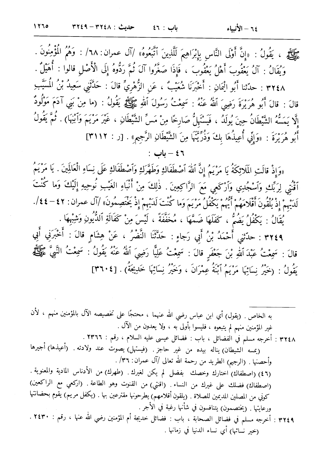 : سمعت رسول الله صلى الله عليه و سلم يقول ( ما من بني آدم مولود إلا يمسه الشيطان حين يولد فيستهل صارخا من مس الشيطان غير مريم وابنها ) . ثم يقول أبو هريرة { وإني أعيذها بك وذريتها من الشيطان الرجيم }