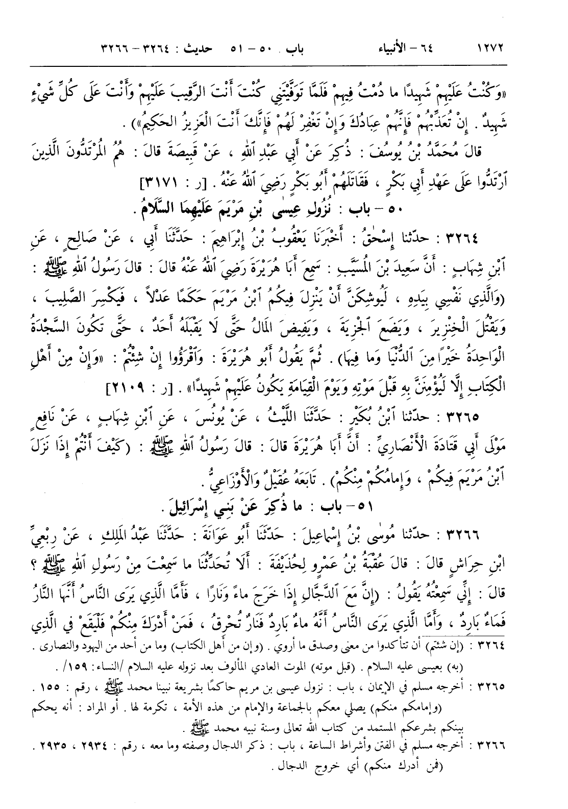 : قال رسول الله صلى الله عليه و سلم ( كييف أنتم إذا نزل ابن مريم فيكم وإمامكم منكم ) . تابعه عقيل والأوزاعي